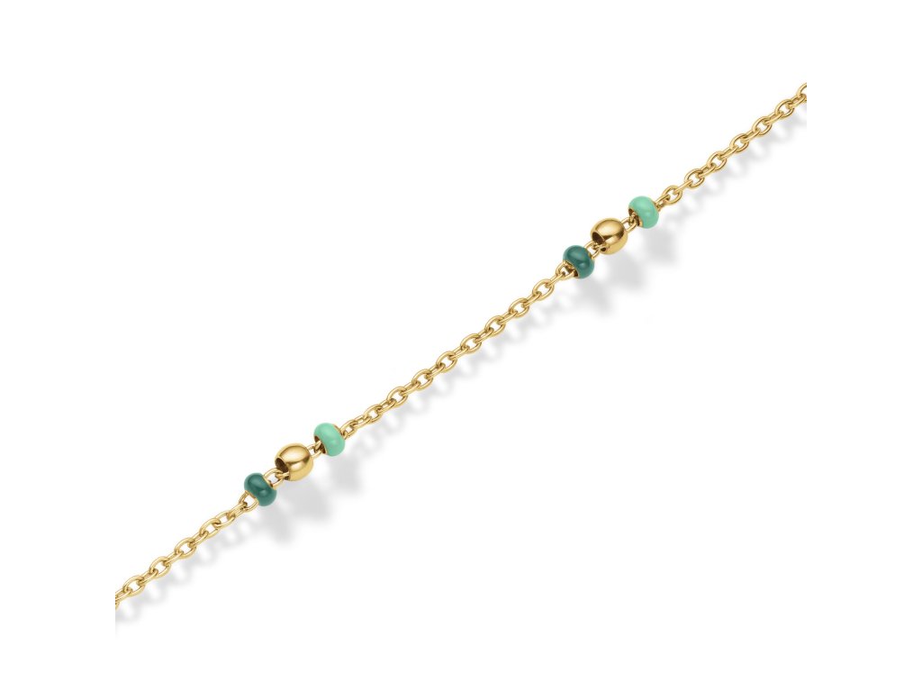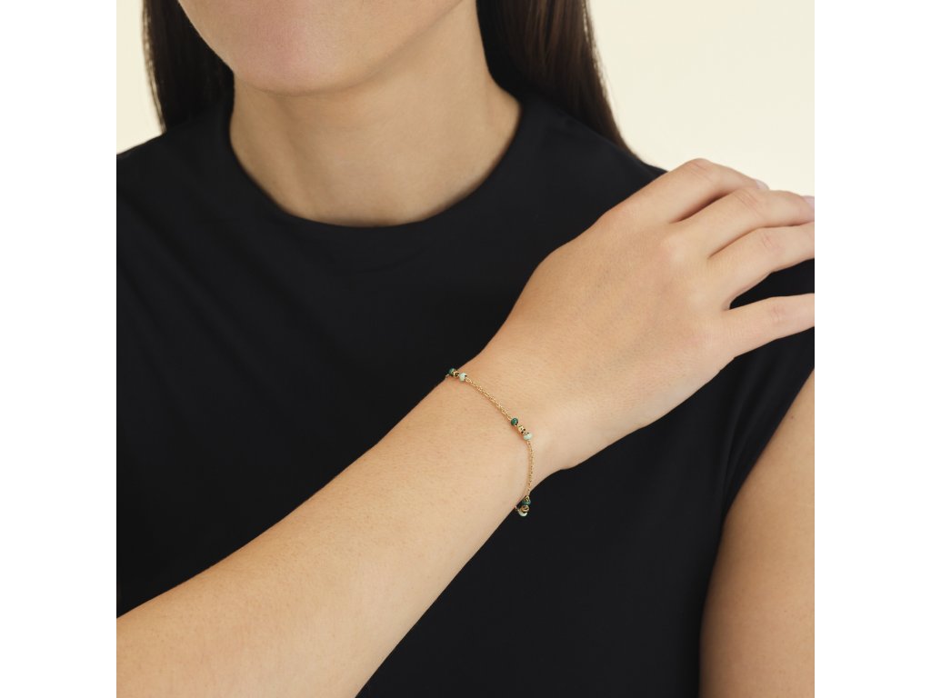 Náramek má zlatou barvu a je řetízkový. Jeho obvod zdobí 9 malých korálků v barvě zlaté a odstínech smaragdově zelené, které spolu vytvářejí harmonický celek. Tento šperk ocení ženy, které baví jemné doplňky.