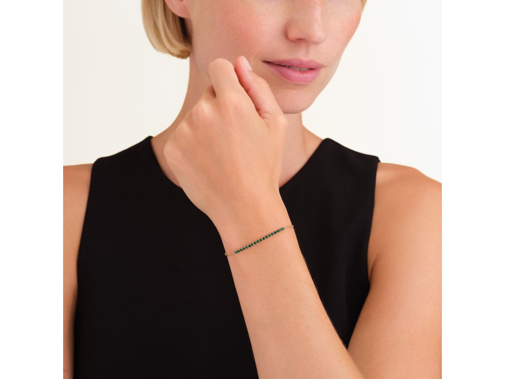 Decentní řetízek s drobnými očky je doplněn zářivými zelenými krystaly, které náramku dodávají velmi svěží elegantní vzhled.