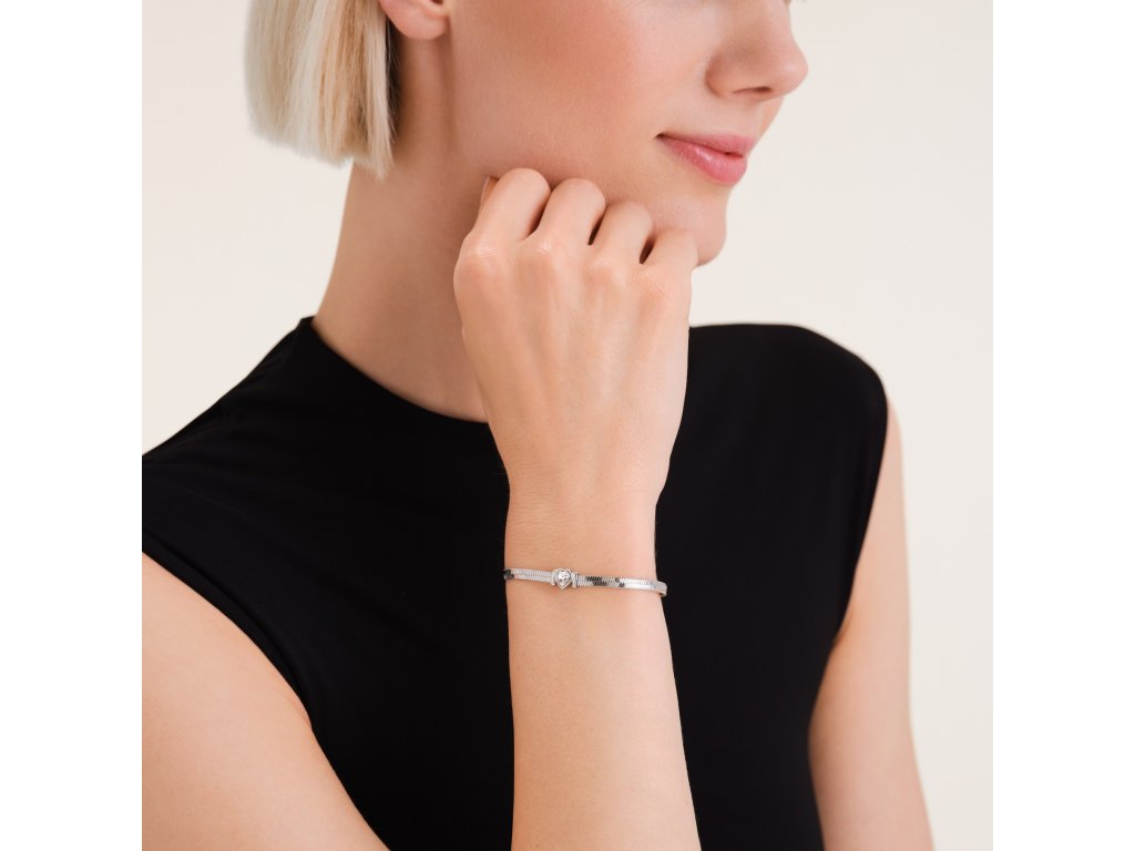 Snake Heart Bracelet zaujme moderním designem a jemným detailem v podobě čirého krystalu ve tvaru srdce, který je precizně zasazený do středu šperku.