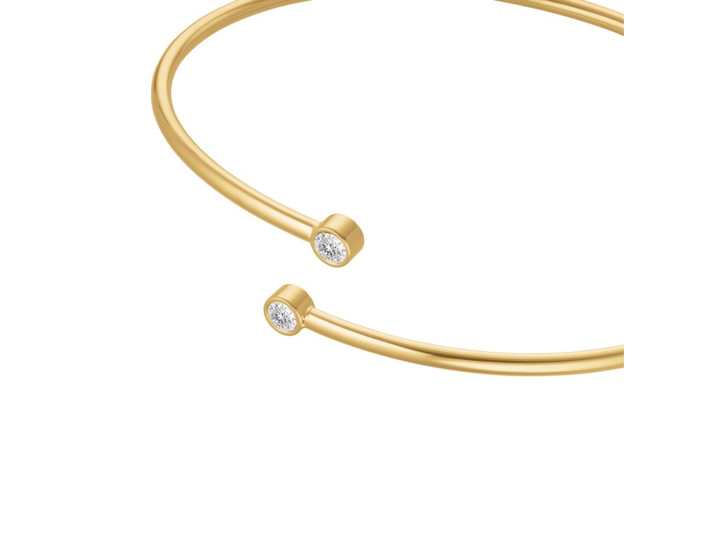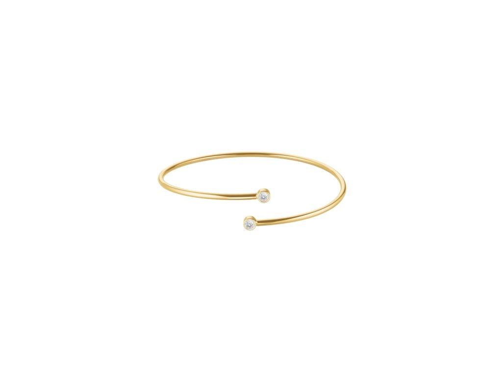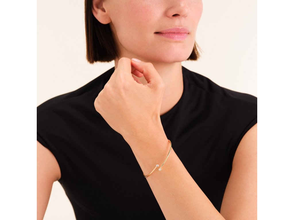 Pevná konstrukce z pozlacené nerezové oceli v kombinaci s dvěma krystaly zasazenými proti sobě vytváří rafinovaný a čistý vzhled. Náramek se pohodlně navléká a díky svému tvaru drží na ruce bez potřeby zapínání.