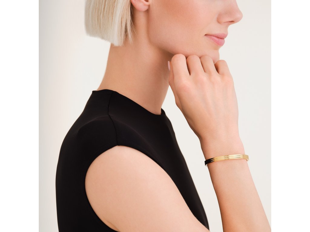 Vyrobený je z pozlacené nerezové oceli v pevném oválném tvaru o rozměrech 6 × 5 cm, pohodlně sedí na zápěstí a snadno se kombinuje s dalšími šperky. Stylový doplněk pro každodenní nošení i vrstvení.