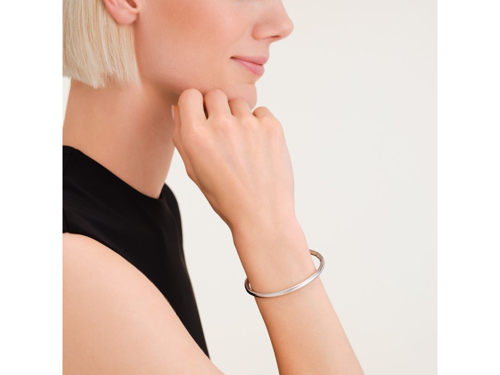 Vyrobený je z nerezové oceli a tvarovaný do oválné siluety o rozměrech 6 × 5 cm. Pohodlně padne na zápěstí a snadno se kombinuje s dalšími šperky.