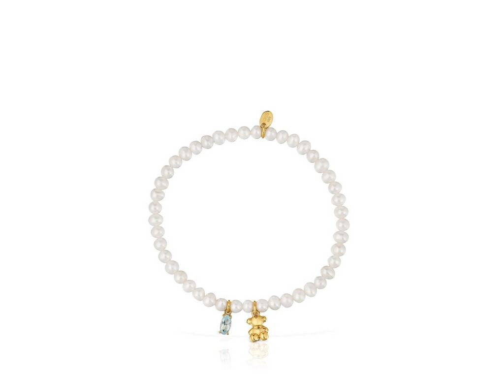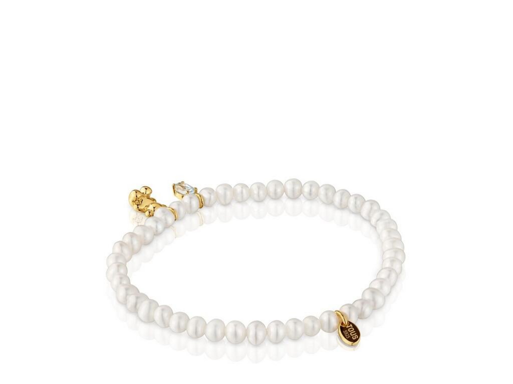 Dámský náramek TOUS s bílými perlami, topazem a ikonickým medvídkem působí něžně a elegantně, s jemným nádechem luxusu.