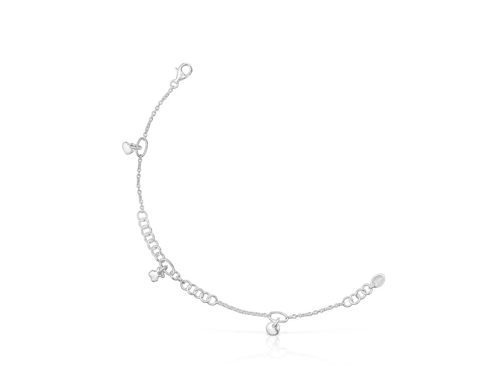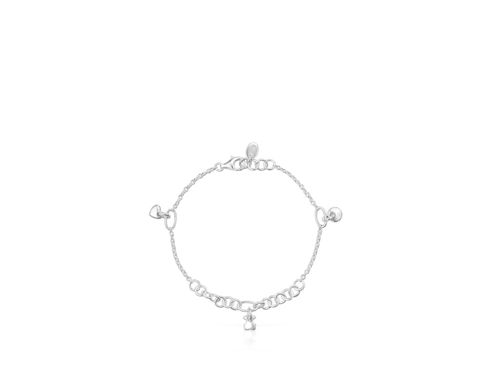Náramek Tous Luah vyrobený ze stříbra ryzosti 925 s třemi motivy o velikosti 0,5 – 0,6 cm (medvídek, měsíc a srdce) na řetízku s různými očky. Délka náramku: 17,5 cm. Technologie výroby: odlévání.Doplňkové parametry
