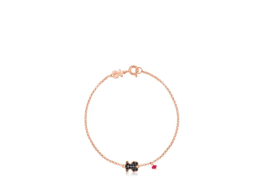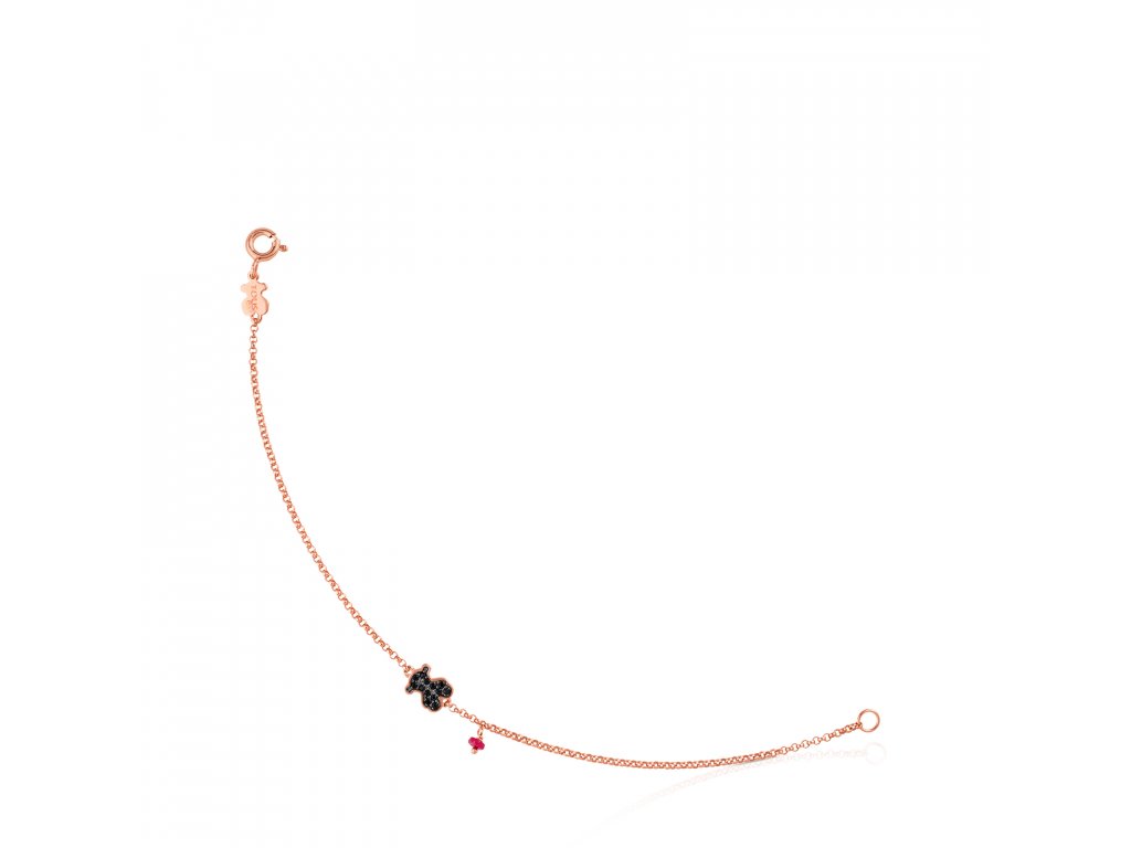 Náramek Tous Motif ze růžového stříbra Vermeil s motivem medvídka se zasazenými spinely a rubínem. Velikost motivu: 9 mm. Délka náramku: 17,5 cm. Stříbro Vermeil – vysoce kvalitní stříbro s nejvyšší ryzostí 925/1000 pokryté vrstvou 18K zlata.Doplňkové parametry