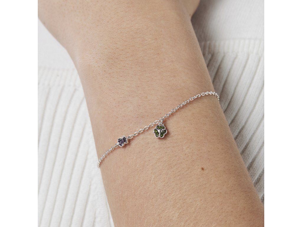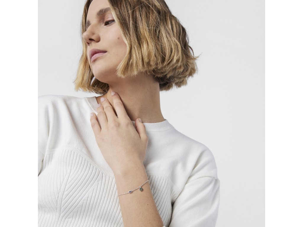 Náramek TOUS New Motif z mincovního stříbra s květinou z chromdiopsidů o rozměrech 5 × 5,46 mm a medvídkem z ametystů o rozměrech 4,6 × 3,8 mm ve vzdálenosti 15 mm. Délka náramku: 17,5 cm.Doplňkové parametry
