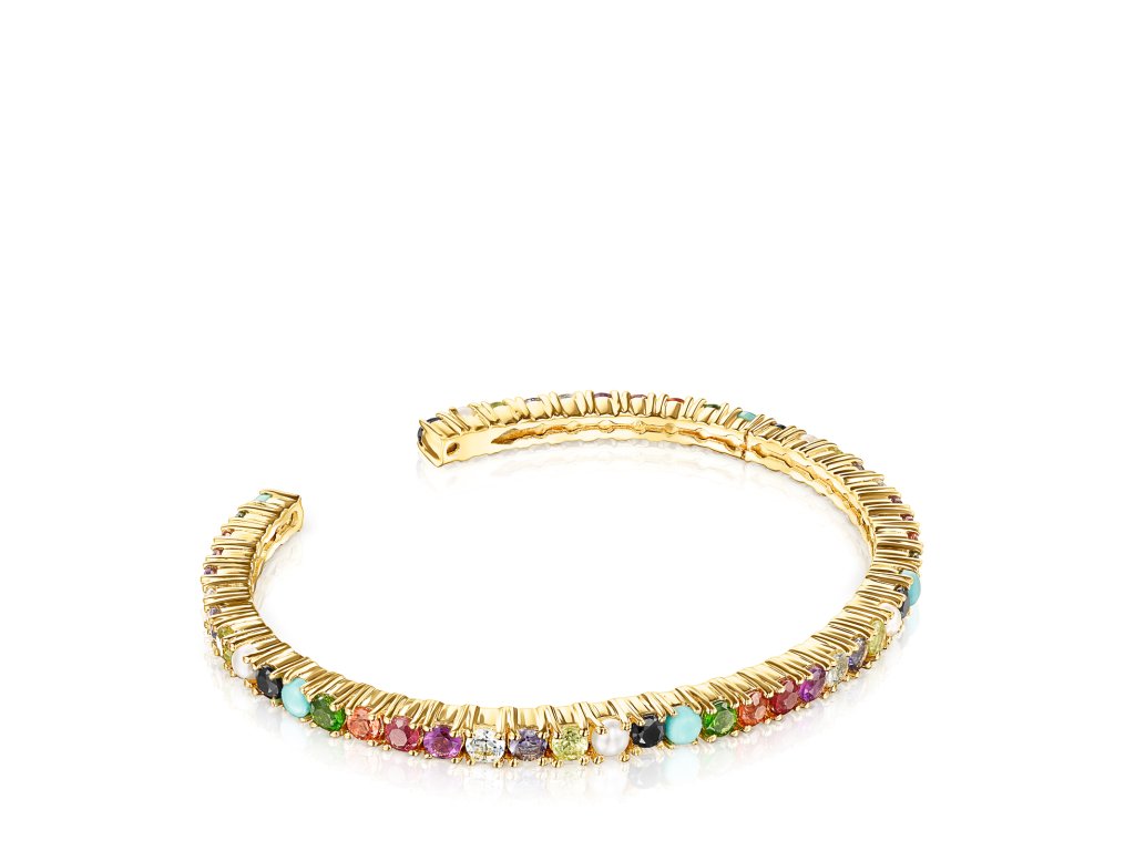 Náramek Tous Straight Color vyrobený ze žlutého stříbra Vermeil se spinelem, peridotem, iolitem, modrým topasem, ametystem, rubínem, oranžovým safírem, diopsidem, pěstovanou sladkovodní perlou a tyrkysem. Rozměry: 5,96 cm x 4,84 cm. Technologie výroby: odlévání. Stříbro Vermeil – vysoce kvalitní stříbro s nejvyšší ryzostí 925/1000 pokryté vrstvou 18K zlata.Doplňkové parametry