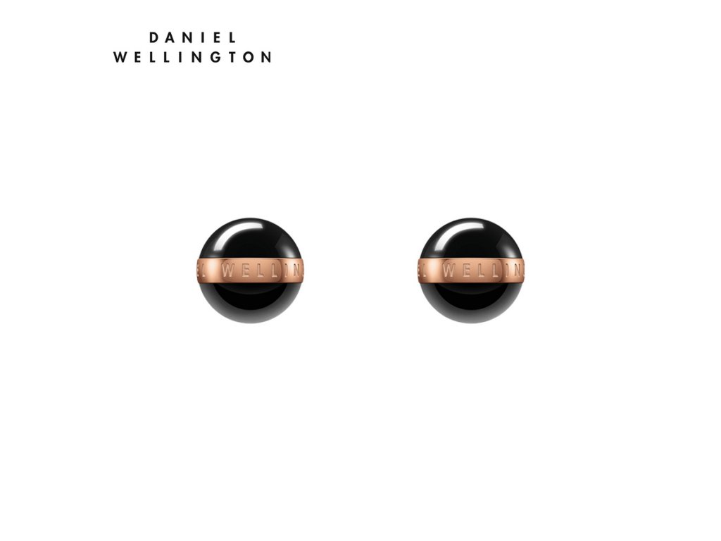 Jemné náušnice ve tvaru kuličky černé barvy, doplněné zlatorůžovým pruhem s logem Daniel Wellington, ideální v kombinaci s náhrdelníkem AspirationDoplňkové parametry