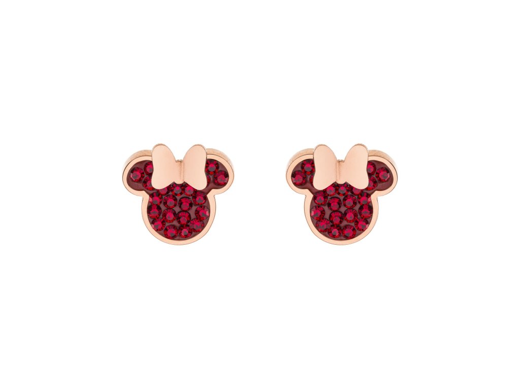 Náušnice ve tvaru postavičky myšky Minnie Mouse od Disney jsou vyrobené z pozlacené nerezové oceli růžovozlatavé barvy, s níž velmi pěkně ladí červené krystaly, jimiž jsou náušnice z velké části dekorovány. Tyto náušnice se zapínají puzetkou, která zajišťuje pohodlné nošení a zabraňuje jejich ztrátě. Jsou dodávány ve stylové krabičce.