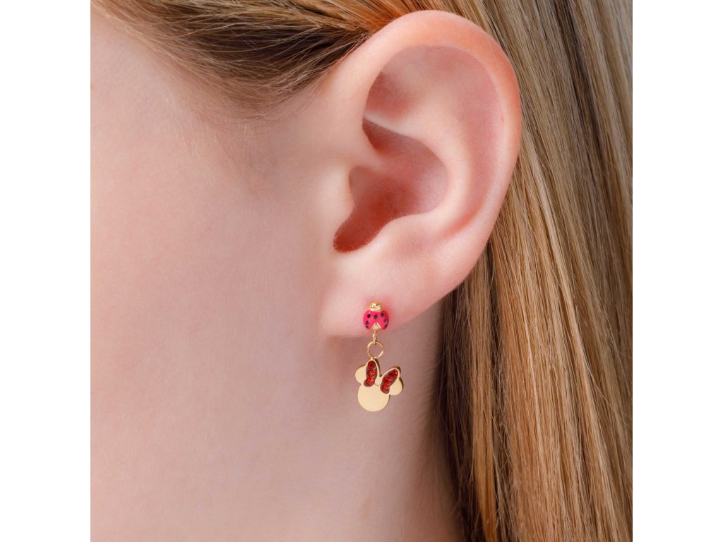 Místo puzetky na oušku sedí roztomilá beruška zdobená černými krystaly, ke které je připevněn přívěsek ve tvaru oblíbené myšky Minnie Mouse. Té nemůže chybět tradiční mašle, která se třpytí červenými krystaly.