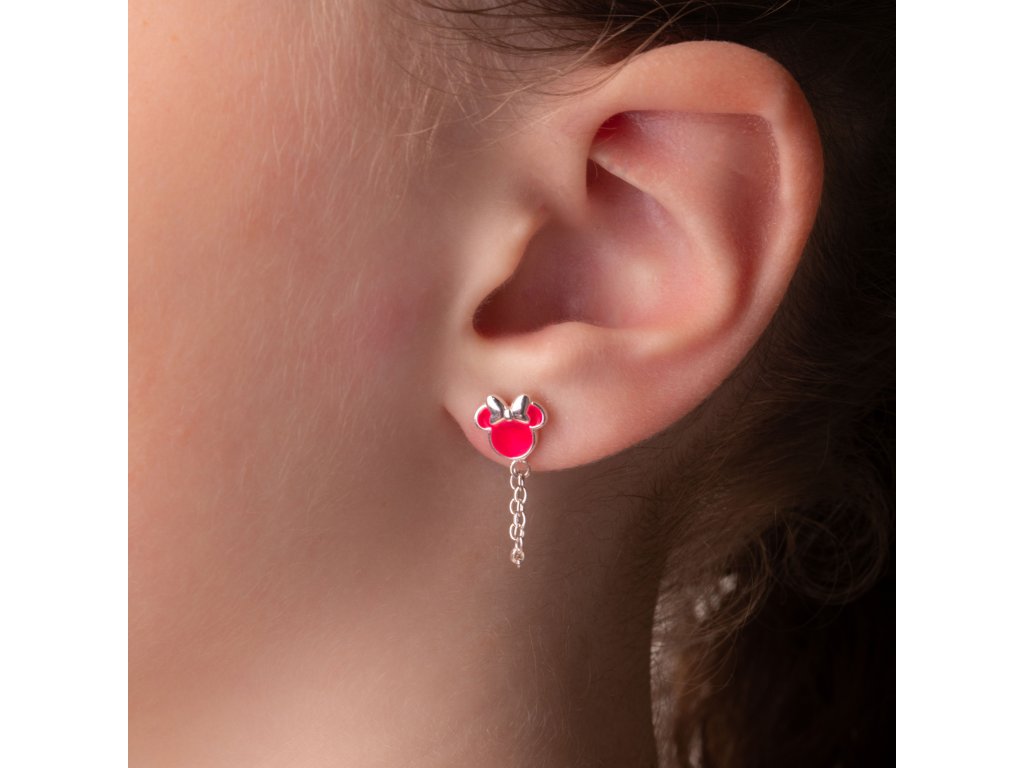 Náušnice ve tvaru postavičky myšky Minnie Mouse od Disney jsou vyrobené z velmi kvalitního stříbra ryzosti 925/1000 s lesklou povrchovou úpravou. Zdobené jsou růžovým smaltem, který na šperku pěkně vyniká.