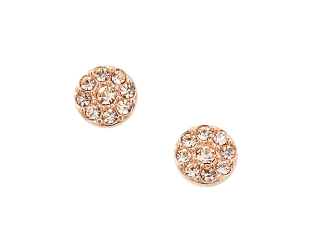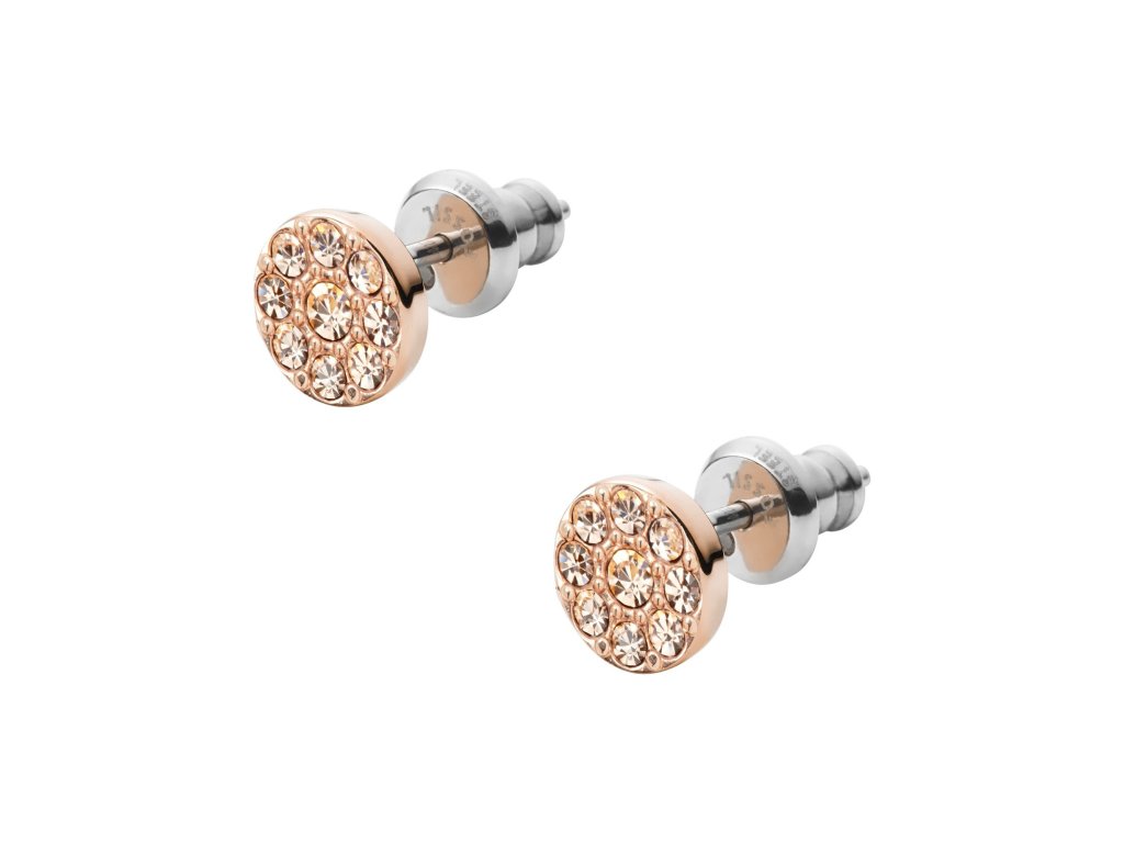 Doplňte svůj outfit půvabným kouskem v designu moderního klenotu, drobnými náušnice od Fossil s nádechem romantiky.Náušnice upoutají pozornost zářivými krystaly, vsazenými do kolečka v barvě růžového zlata. Náušnice působí velmi žensky a díky střídménu designu se hodí ke každodennímu nošení. Samozřejmostí je kvalitní materiál ve formě nerezové oceli a bezpečnostní zapínání.