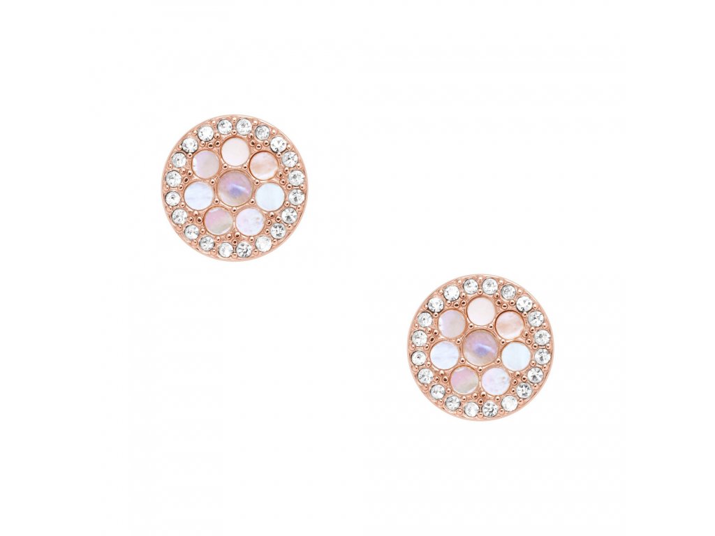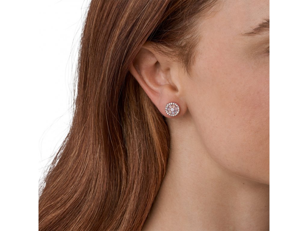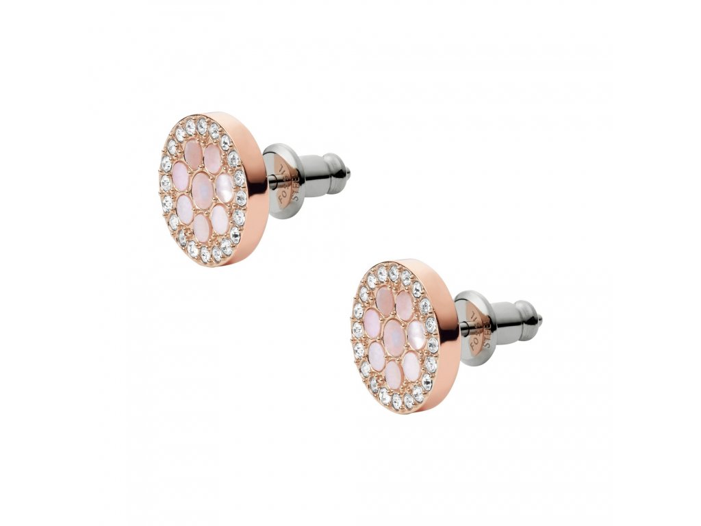 Náušnice ve tvaru kolečka jsou vyvinuté z vysoce kvalitní oceli. Růžovozlatá barva jim dodává na půvabu a zdobení perleťovými akcenty a krystaly nádech romantiky a ženskosti.