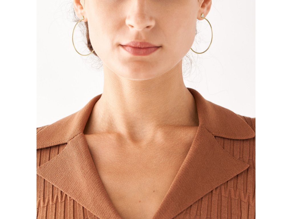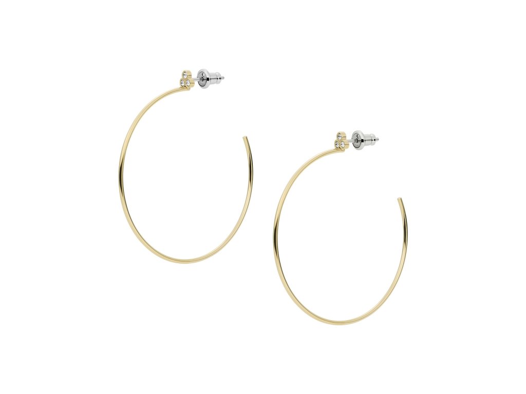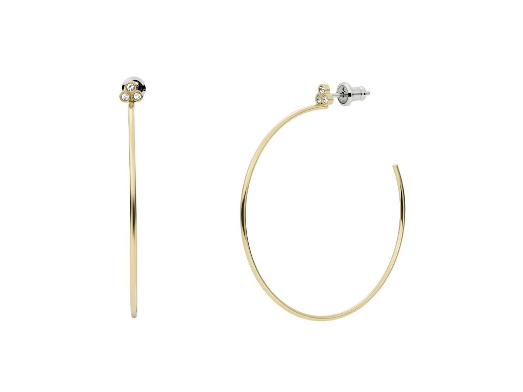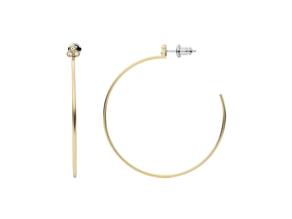 Velké, ale jemné kruhové náušnice od Fossil se díky nenápadnému detailu se třemi třpytivými krystaly stávají sofistikovaným doplňkem. Zalíbí se ženám, preferující něžné a drobné šperky, které mohou nosit každý den.