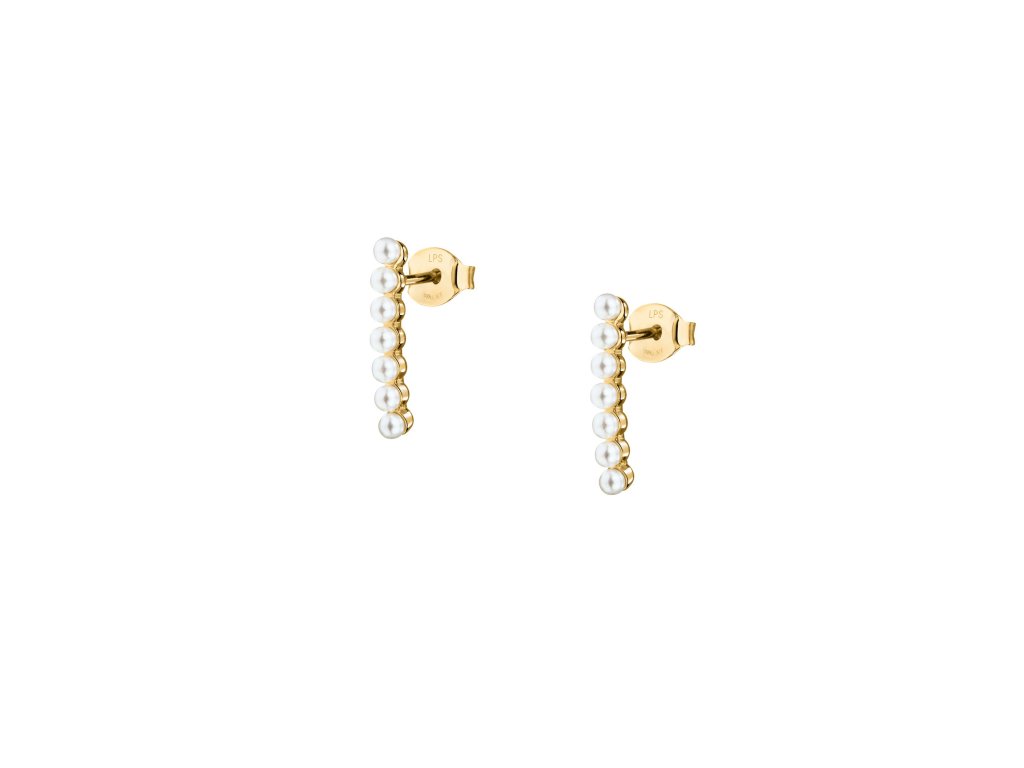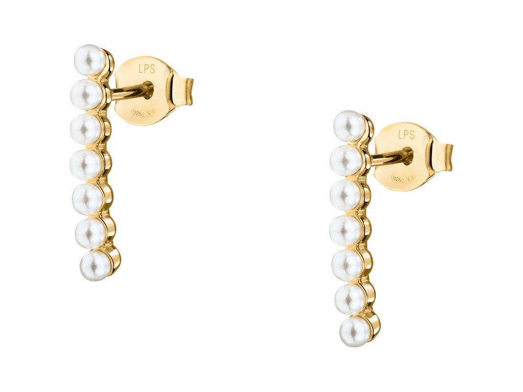 Náušnice z pozlaceného stříbra jsou osázené 7 perlami. Díky zapínání na puzetu a délce 1,5 cm se pohodlně nosí a ladí jak s každodenním, tak večerním outfitem. Jsou vyrobené ze stříbra ryzosti 925/1000 a váží 0,8 g.