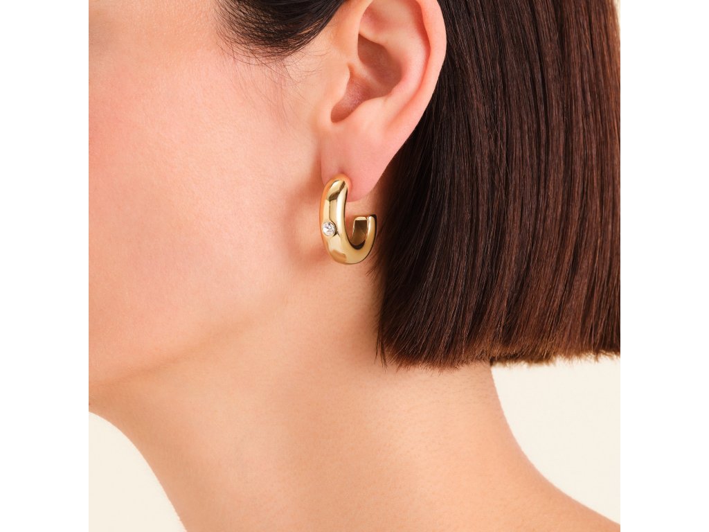 Hladký pozlacený půlkruhový tvar o průměru 2,7 cm je doplněn o jeden centrálně vsazený krystal, který dodává náušnicím sofistikovaný vzhled a jemný lesk. Masivnější silueta působí luxusně, ale zachovává si čisté linie, které zůstávají nadčasové.