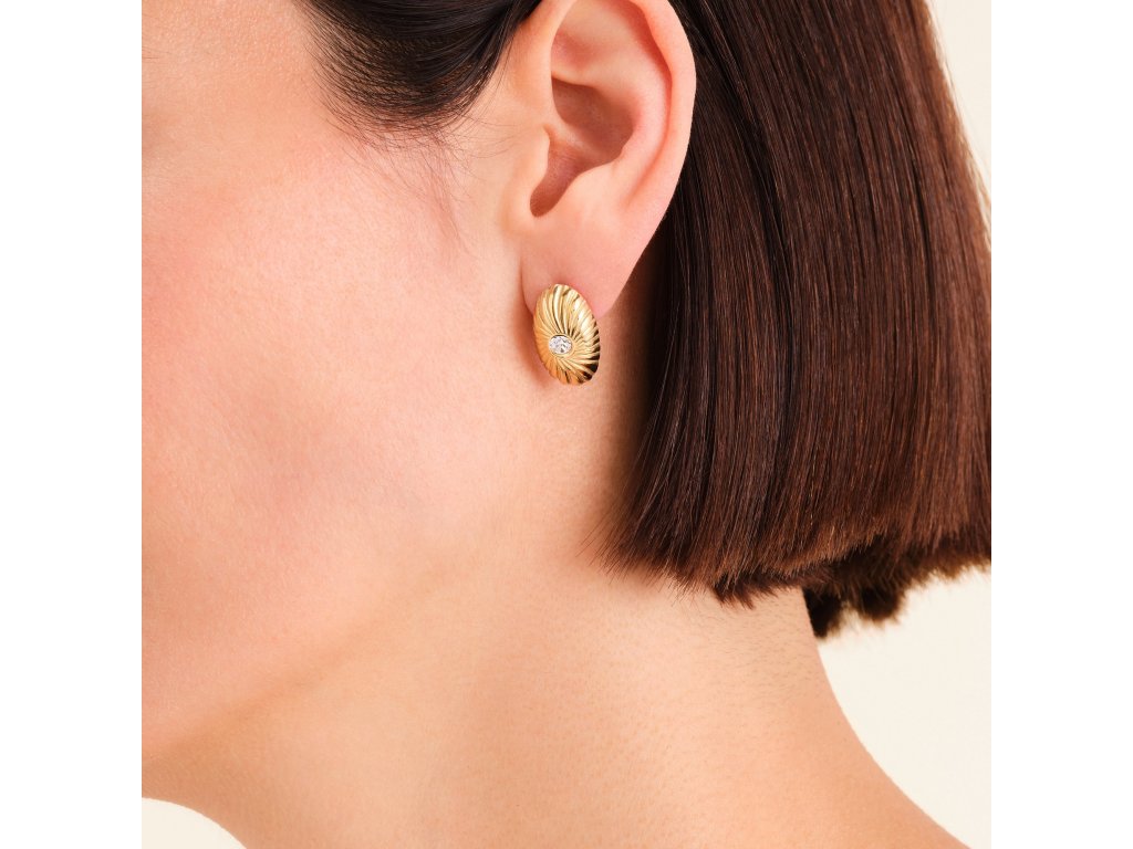 Rýhovaný vzor po celém oválu dodává modelu hloubku a texturu, zatímco centrálně osazený krystal přináší jemný třpyt a šperkový efekt. Náušnice mají velikost 2 × 1,2 cm, což z nich dělá výrazný, ale stále elegantní doplněk. Vyrobeny jsou z pozlacené nerezové oceli.