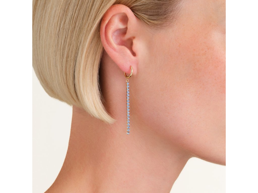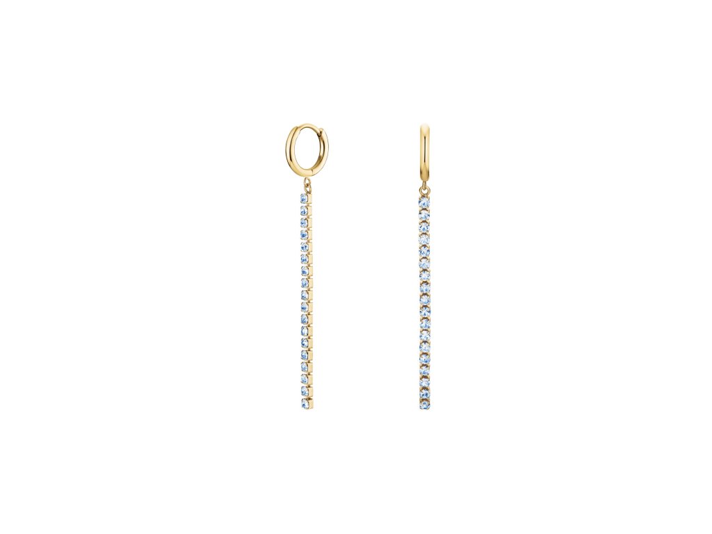 Náušnice zaujmou něžnou kombinací kroužku a tenké linie, která hladce lemuje tvář. Náušnice jsou osazeny 18 světle modrými krystaly, které září s každým vaším pohybem a dodávají vám jemný půvab.