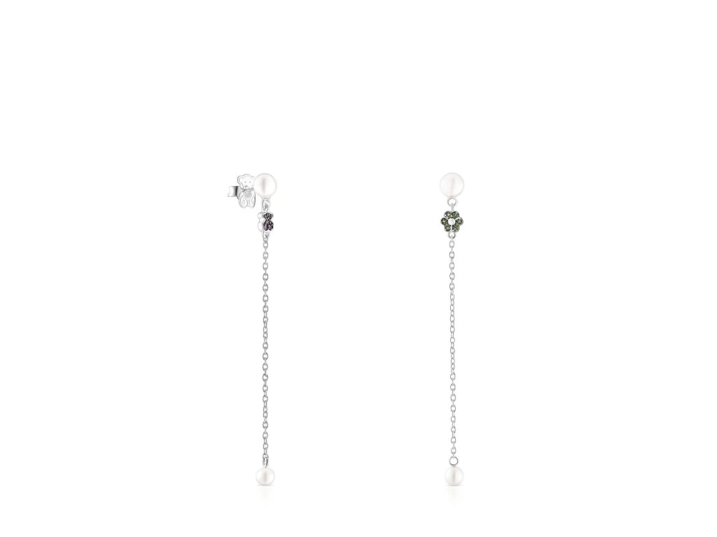 Dlouhé náušnice TOUS New Motif z mincovního stříbra se čtyřmi perlami o průměru přibližně 6 mm. Jedna náušnice má motiv květiny z fasetovaných kulatých chromdiopsidů o velikosti 1 mm a druhá náušnice má motiv medvídka z fasetovaných kulatých ametystů o velikosti 1 mm. Puzetka. Délka: 8 cm.Doplňkové parametry