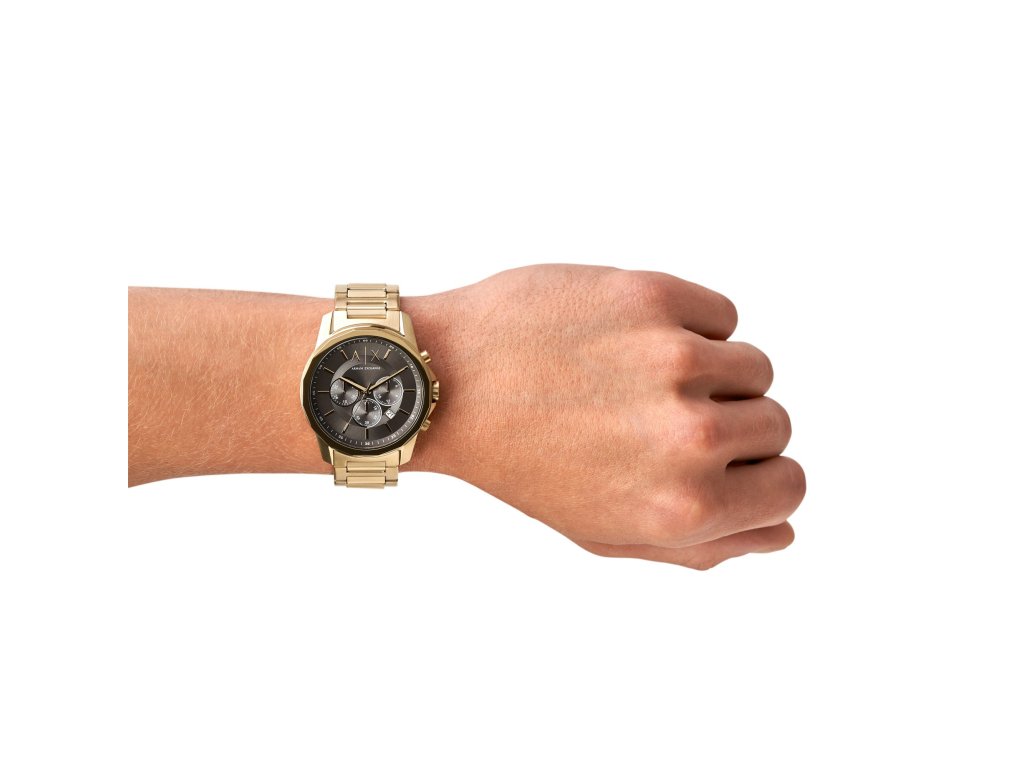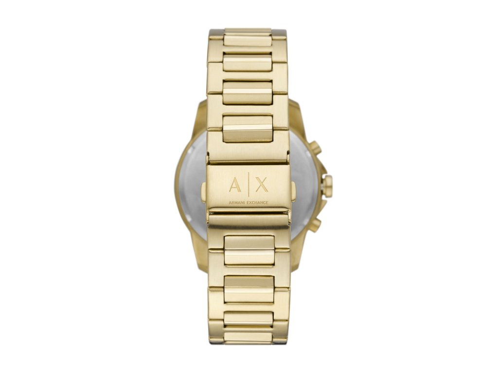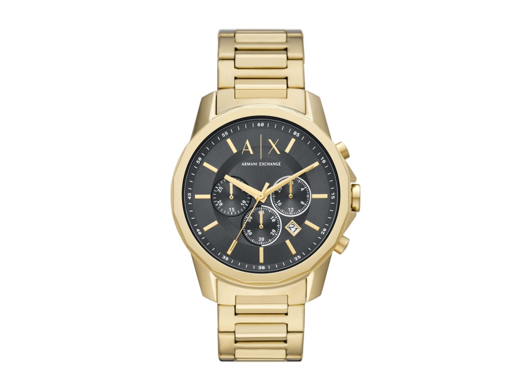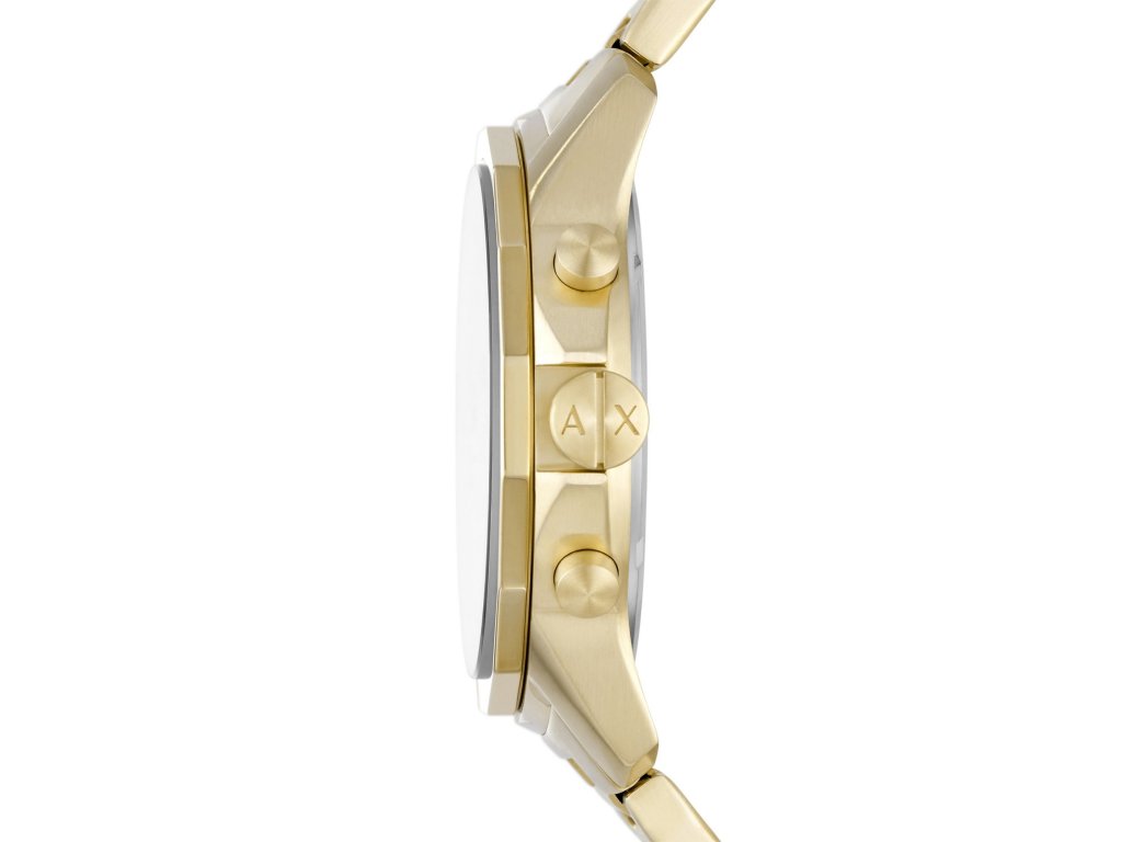 Model Banks AX1721 je vybaven zlatým ocelovým tahem, kulatým pouzdrem ve zlatém tónu a černým číselníkem o průměru 44 mm. Chronograf a datumovka dodávají hodinkám technický náboj a všestrannost. Celek doplňuje minerální sklo a spolehlivý strojek Quartz.