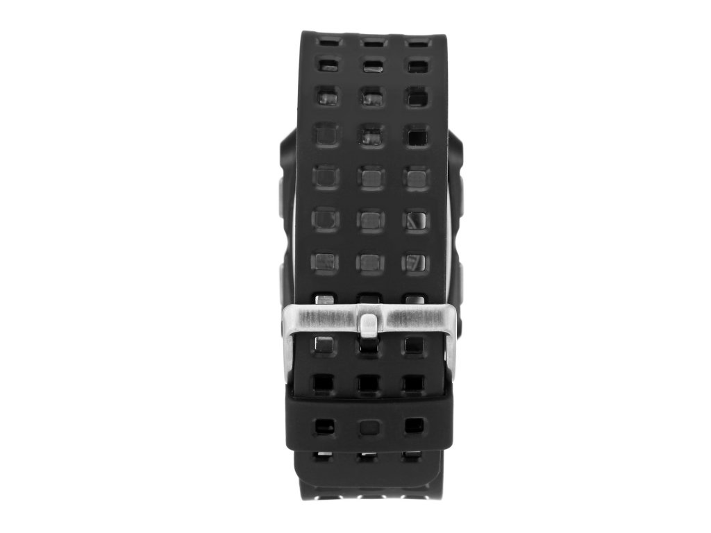 Obdélníkové černé hodinky Armitron s s digitálním displejem a mnoha funkcemi.Doplňkové parametry