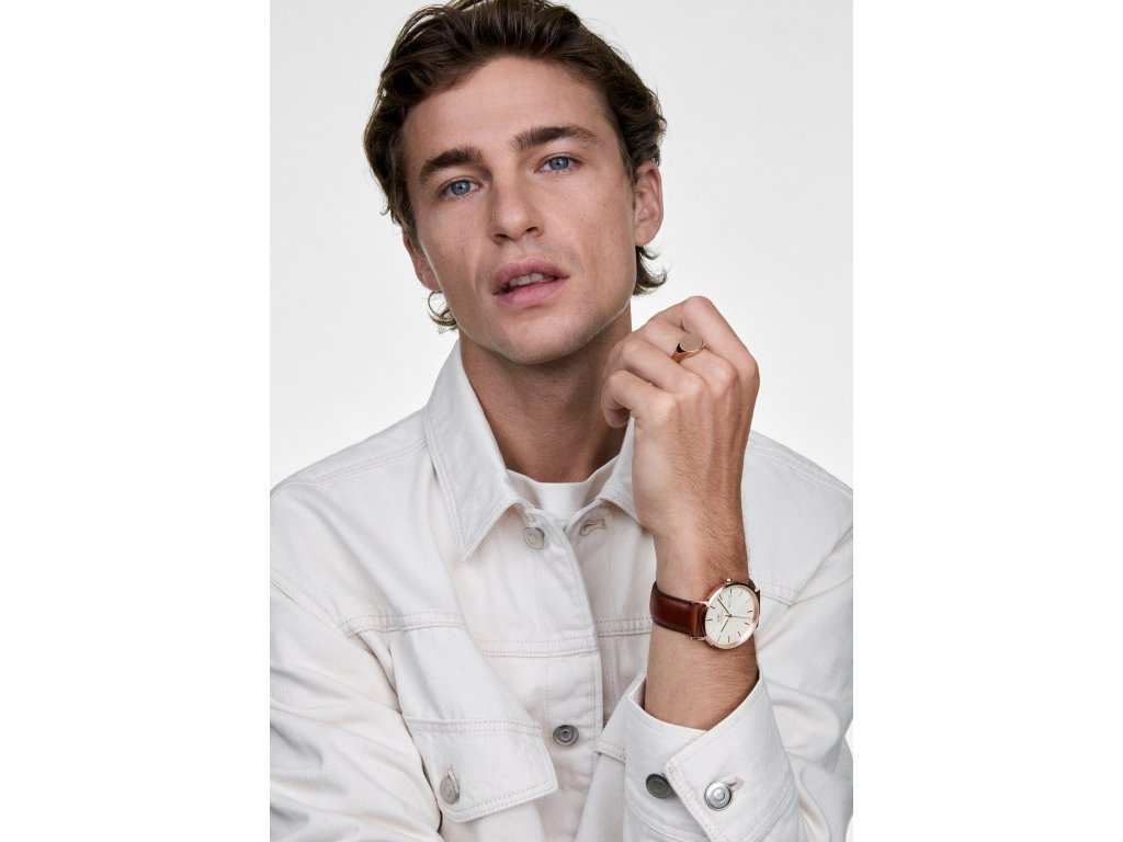 Kulaté pouzdro v teplém růžovozlatém tónu stylově doplňuje hnědý kožený řemínek. Tento řemínek je známý svou hladkou texturou a klasickým stylem.