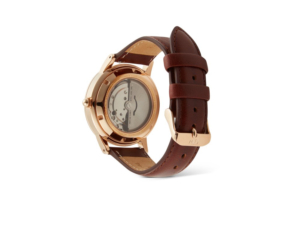 Robustní pouzdro má průměr 40 mm, hnědý řemínek je z kvalitní kůže a sklo je safírové a extrémně odolné. Průhledné zadní víčko odhaluje fascinující automatický mechanismus uvnitř.