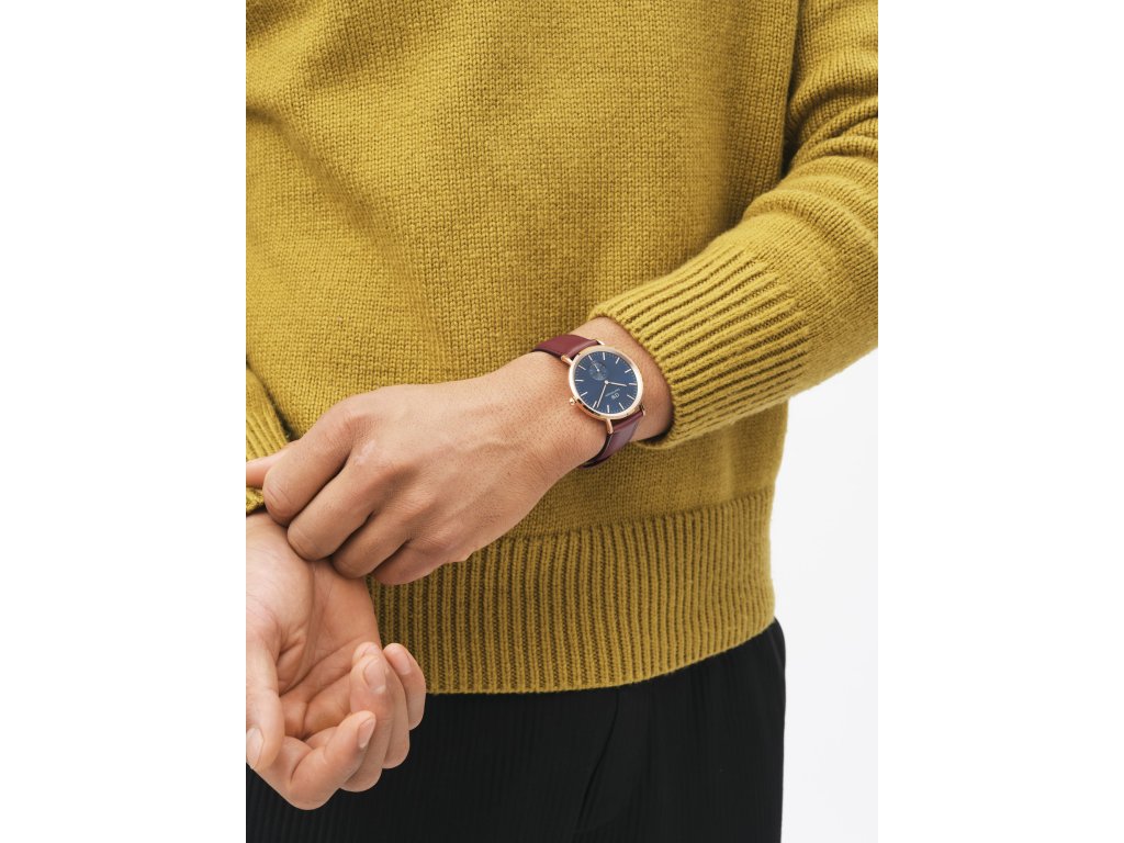 Kulaté pouzdro o průměru 40 mm z nerezové oceli v růžovozlatém provedení dodává hodinkám luxusní vzhled a temně modrý číselník s minimalistickými indexy působí neuvěřitelně noblesně.