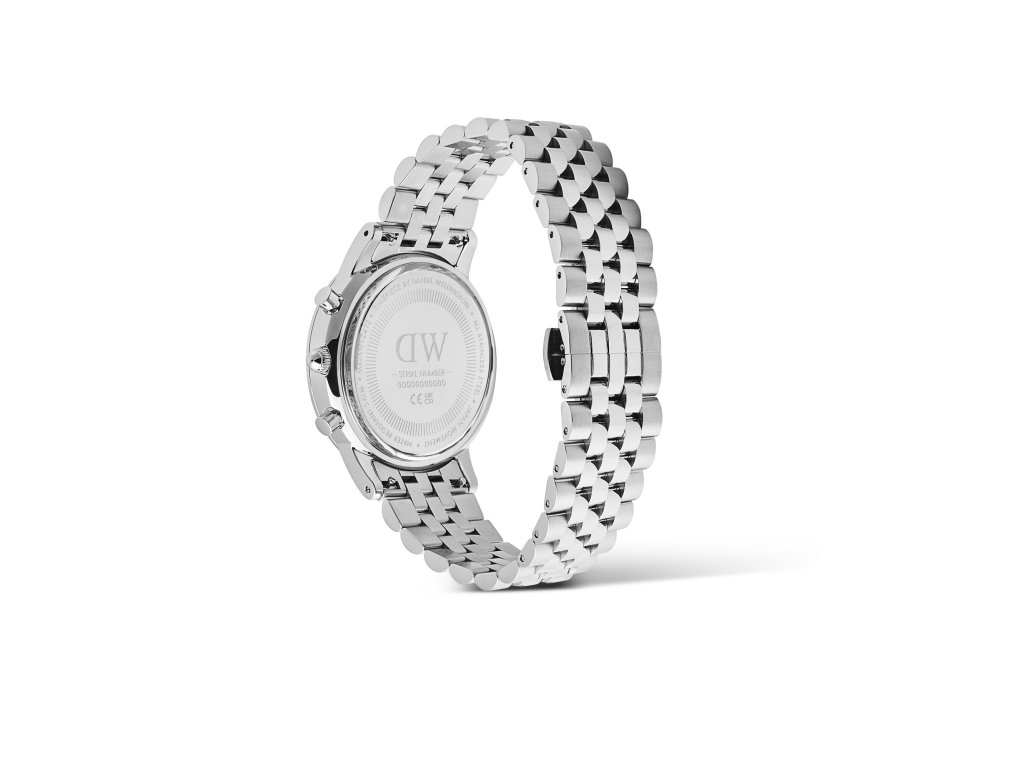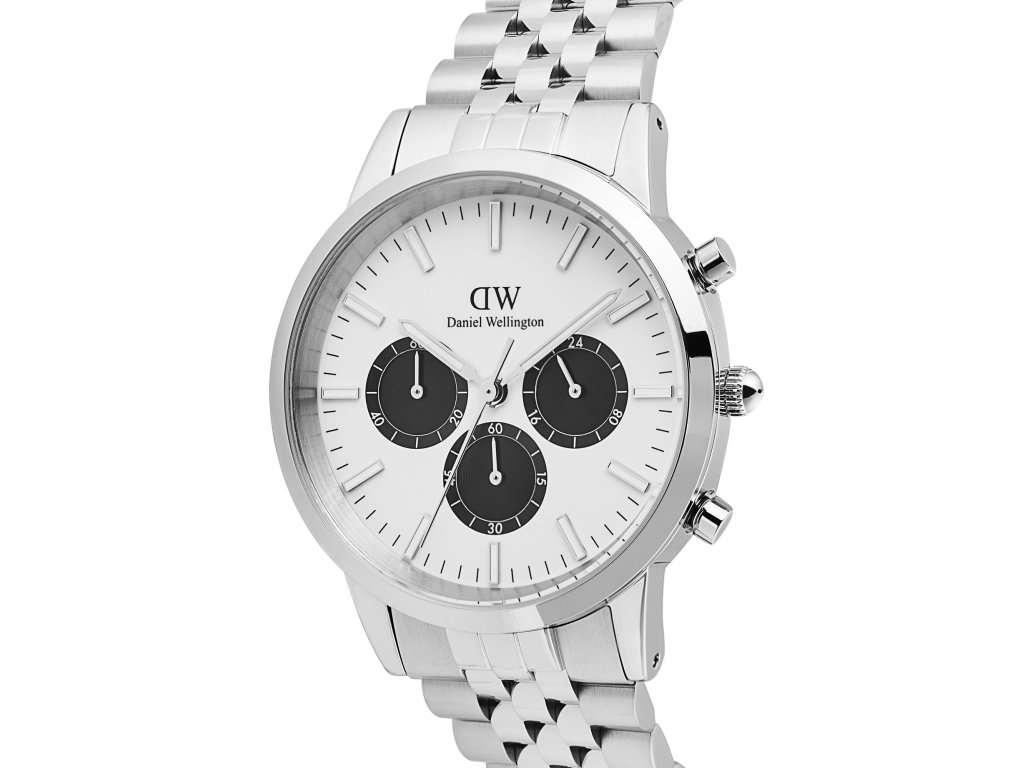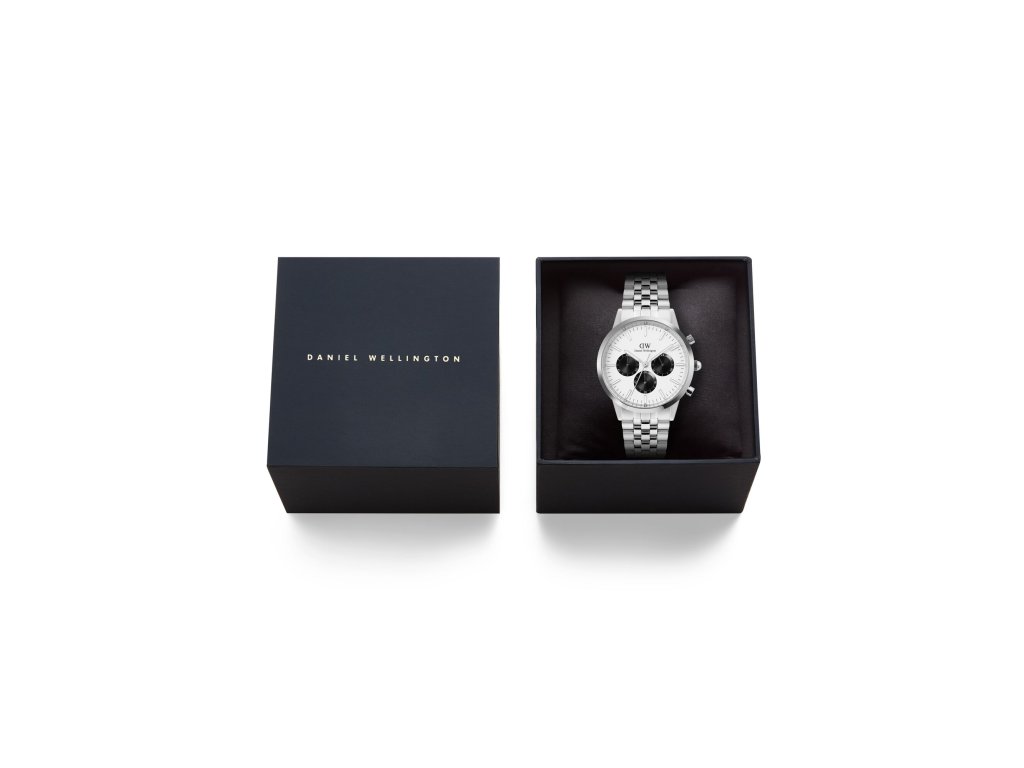 Hodinky Daniel Wellington Iconic Chronograph Arch 5-Link spojují klasické prvky s moderním zpracováním. Bílý číselník s černými subčíselníky působí přehledně a harmonicky. Luminiscenční ručky a indexy zajišťují skvělou čitelnost i za zhoršených světelných podmínek.