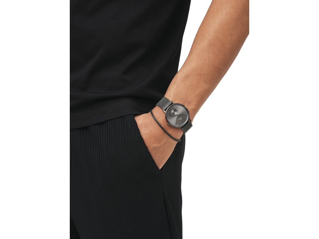 Kulaté pouzdro má průměr 40 mm a jemný meshový tah je vyroben z kvalitní ušlechtilé oceli v šedé barvě. Grafitově šedý je i číselník hodinek s minimalistickými indexy, což hodinám dodává sofistikovaný vzhled a nádech luxusu. Kvalitní minerální sklo zajišťuje ochranu proti poškrábání.