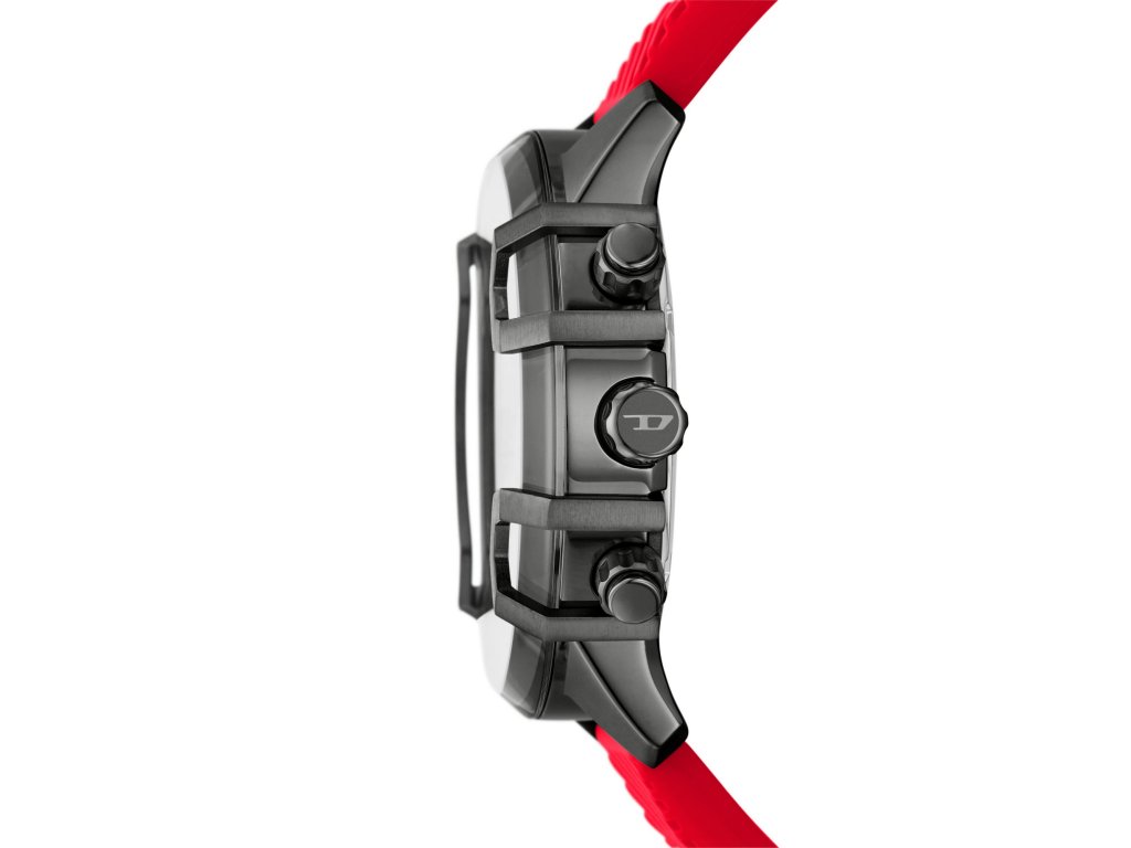 Model DZ4673SET je vybaven červeným silikonovým řemínkem, kulatým pouzdrem z oceli v šedém tónu a šedým číselníkem o průměru 48 mm. Dominantní chronograf, datumovka a robustní zpracování zvýrazňují technický charakter hodinek. Celek chrání minerální sklo a pohání spolehlivý strojek Quartz.