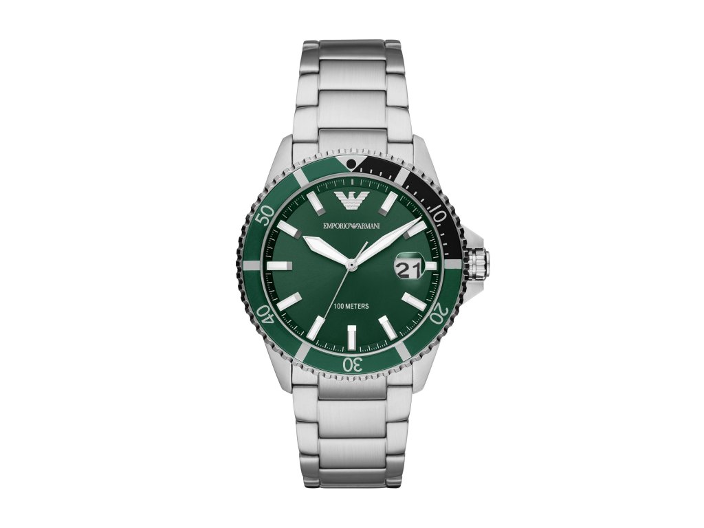 Tmavě zelený číselník o průměru 42 mm zdobí výrazné detaily a ikonické logo orla Emporio Armani. V harmonickém kontrastu pak působí ocelový tah. Užijte si precizní měření času s analogovým zobrazením a praktickou datumovkou. Hodinky jsou také vybaveny funkcí chronografu.
