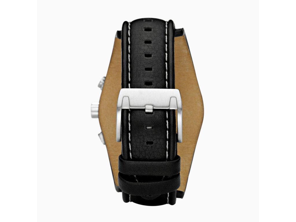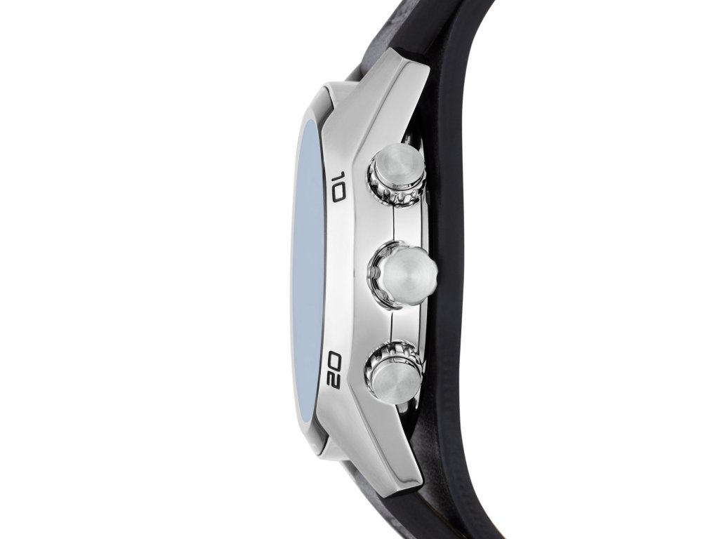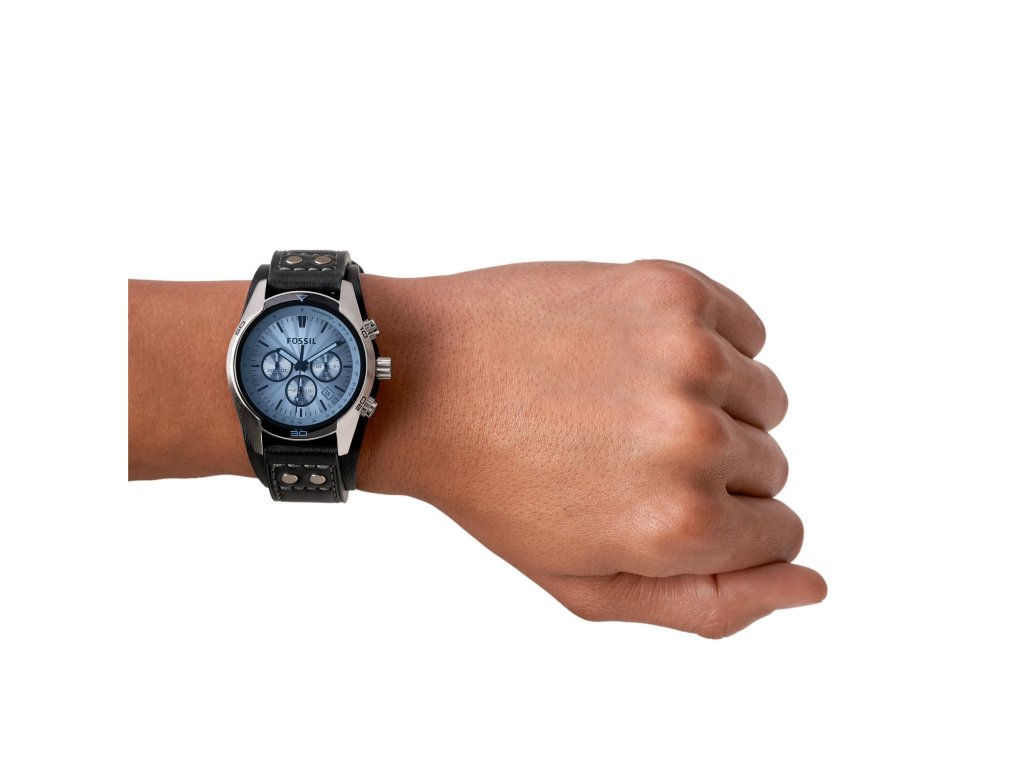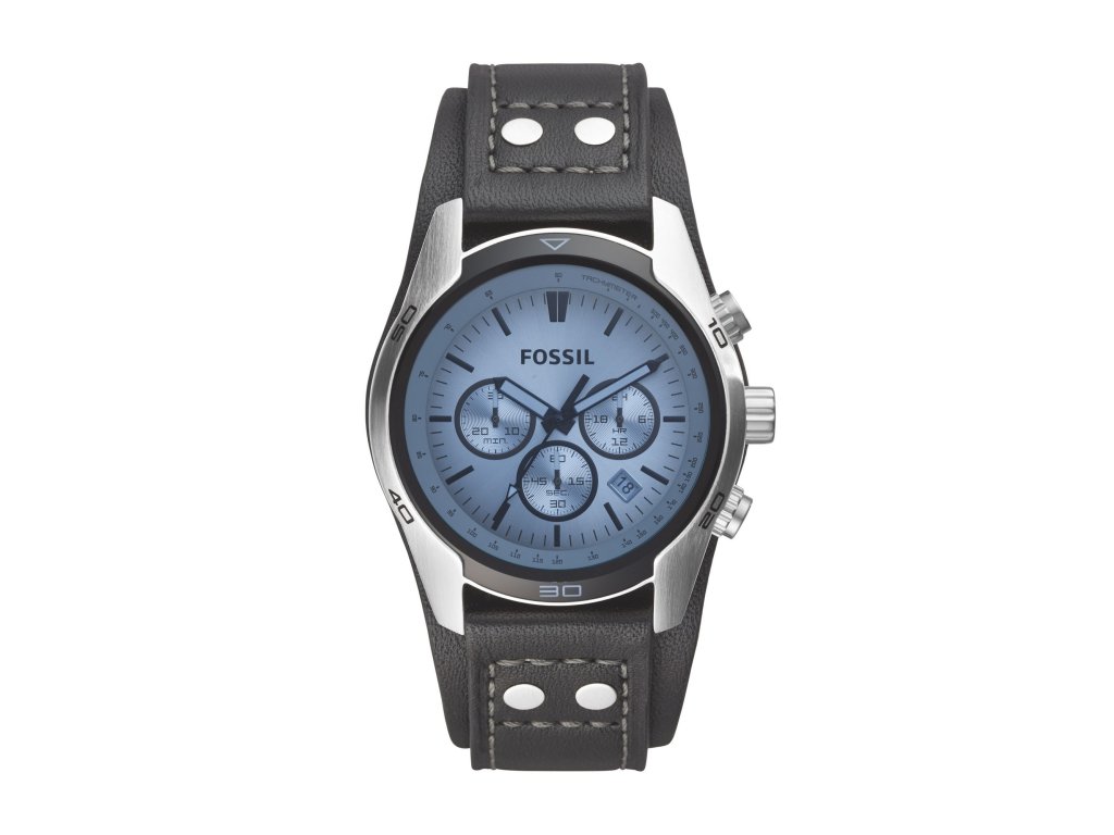 Do kulatého stříbrného pouzdra masivnějšího charakteru z nerezové oceli je zasazen středně velký číselník modré barvy s průměrem 44 mm. S černým koženým řemínkem vytváří vizuálně působivou kombinaci. Číselník je dále vybaven chronografem, datumovkou, jednoduchými indexy a stylovými ručkami. Hodinky jsou navíc odolné a komfortní pro každodenní nošení. Jsou tak ideální volbou pro muže, kteří touží po opravdu funkčním kousku.