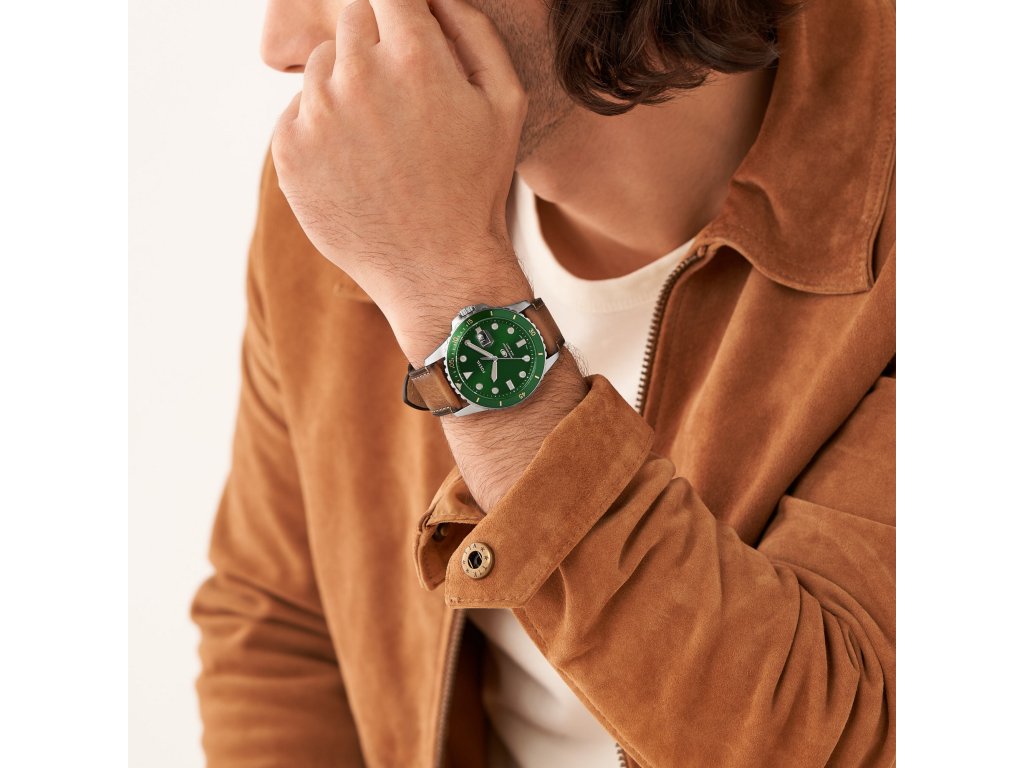 Středně velký číselník zelené barvy o průměru 42 mm je vsazen do pouzdra z nerezové oceli stříbrné barvy, z něhož pro svou půvabnou přírodní barvu vyniká. V ní se také vyjímají stylové indexy různých geometrických tvarů, masivnější ručky a datumovka. Hnědý kožený řemínek výjimečný design hodinek doplňuje a zaručuje pohodlné nošení.