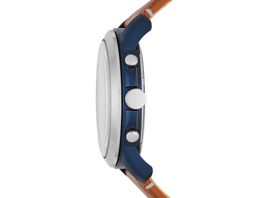 Do kulatého stříbřitého pouzdra z nerezové oceli je vsazen středně velký číselník o průměru 44 mm. Kožený řemínek hnědé barvy poté dodává hodinkám unikátní vzhled a přírodní a nadčasový prvek. . Na číselníku vystupují moderní ručky, logo, ale především indexy v podobě římských číslic a chronograf.