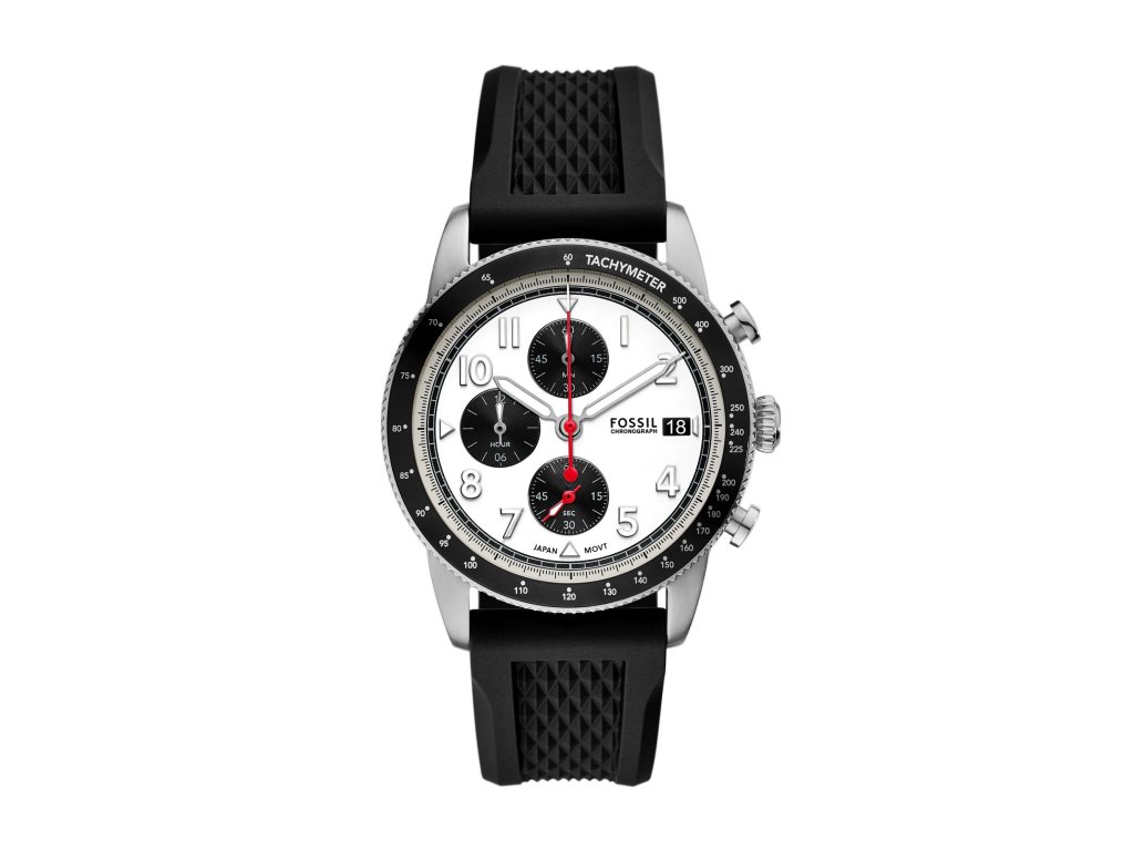 Model FS6087 je vybaven černým silikonovým řemínkem, kulatým pouzdrem ze stříbrné oceli a bílým číselníkem o průměru 42 mm. Nechybí funkční chronograf, datumovka ani tachymetr pro sportovně laděný vzhled i praktické využití. Celek chrání minerální sklo a pohání spolehlivý strojek Quartz.