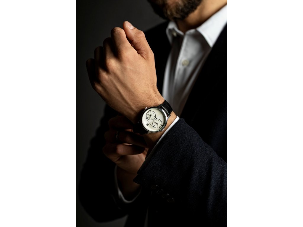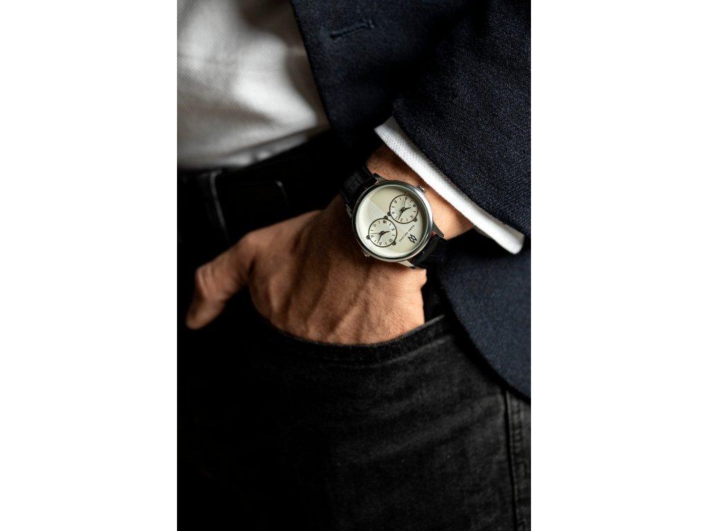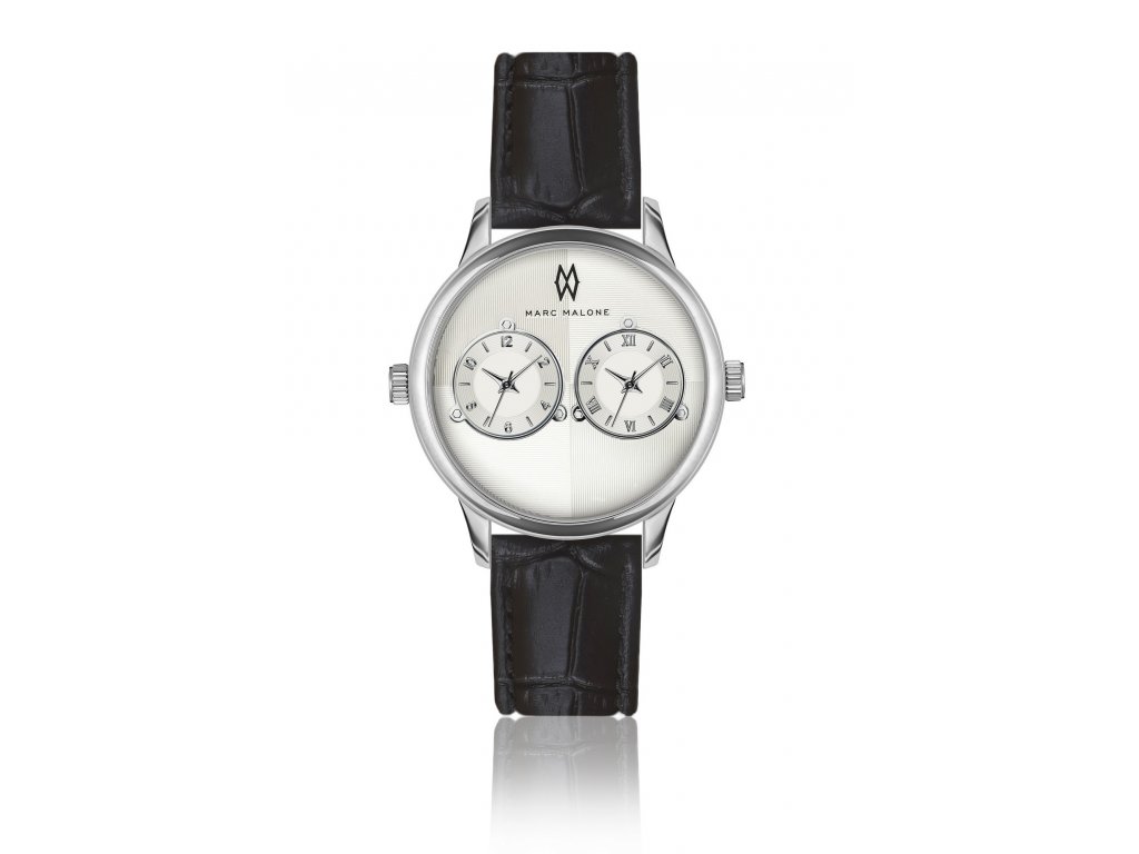 Pánské hodinky značky Marc Malone Louis Croco Black Leather mají černý kožený řemínek se vzorem krokodýlí kůže. Řemínek je široký 20 mm a díky stříbrné sponě pohodlně nastavitelný. Zajímavostí těchto hodinek je stříbrný číselník o průměru 42 mm, který v sobě ukrývá dva menší číselníky. Jeden s římskými, a druhý s klasickými číslicemi. Celý číselník je bezpečně chráněn odolným minerálním sklíčkem.Doplňkové parametry