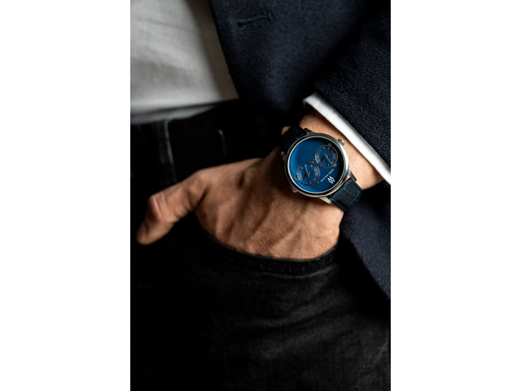 Pánské hodinky značky Marc Malone Philip Croco Blue Leather mají tmavěmodrý kožený řemínek se vzorem krokodýlí kůže. Řemínek je široký 20 mm. Zajímavostí těchto hodinek je tmavěmodrý číselník o průměru 42 mm, který v sobě ukrývá dva menší číselníky. Jeden s římskými, a druhý s klasickými číslicemi. Celý číselník je bezpečně chráněn odolným minerálním sklíčkem.Doplňkové parametry