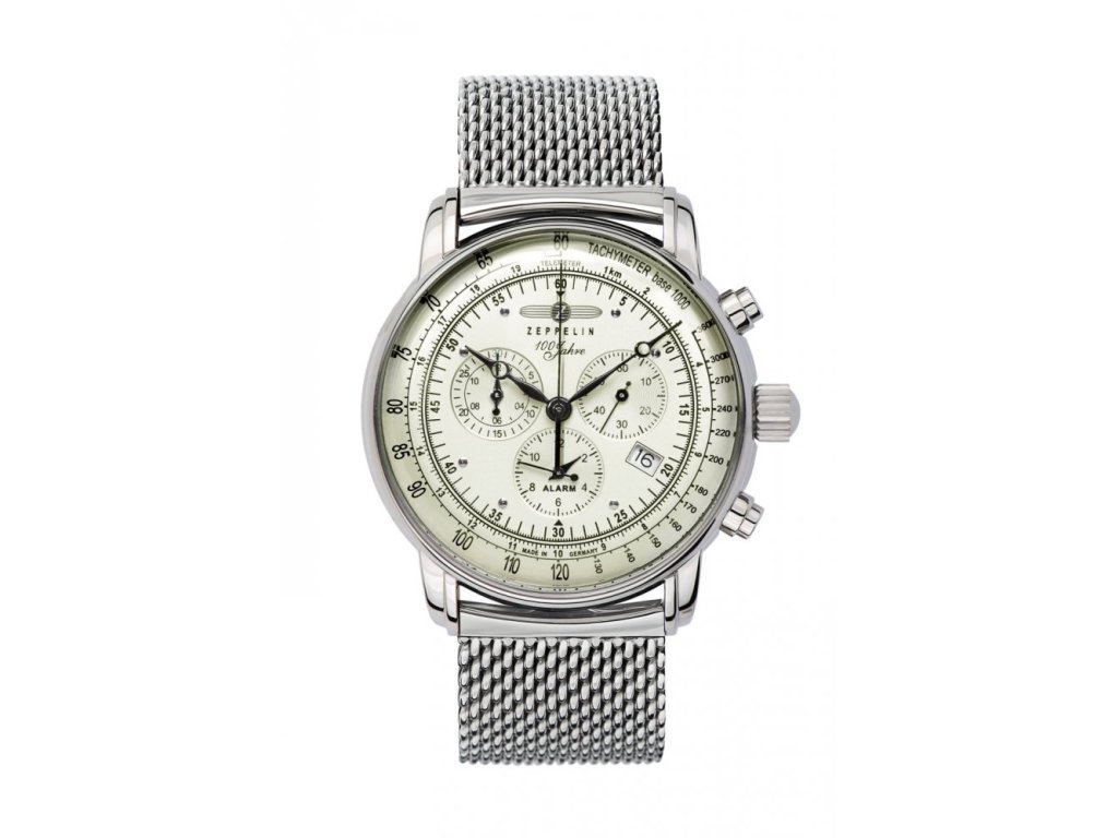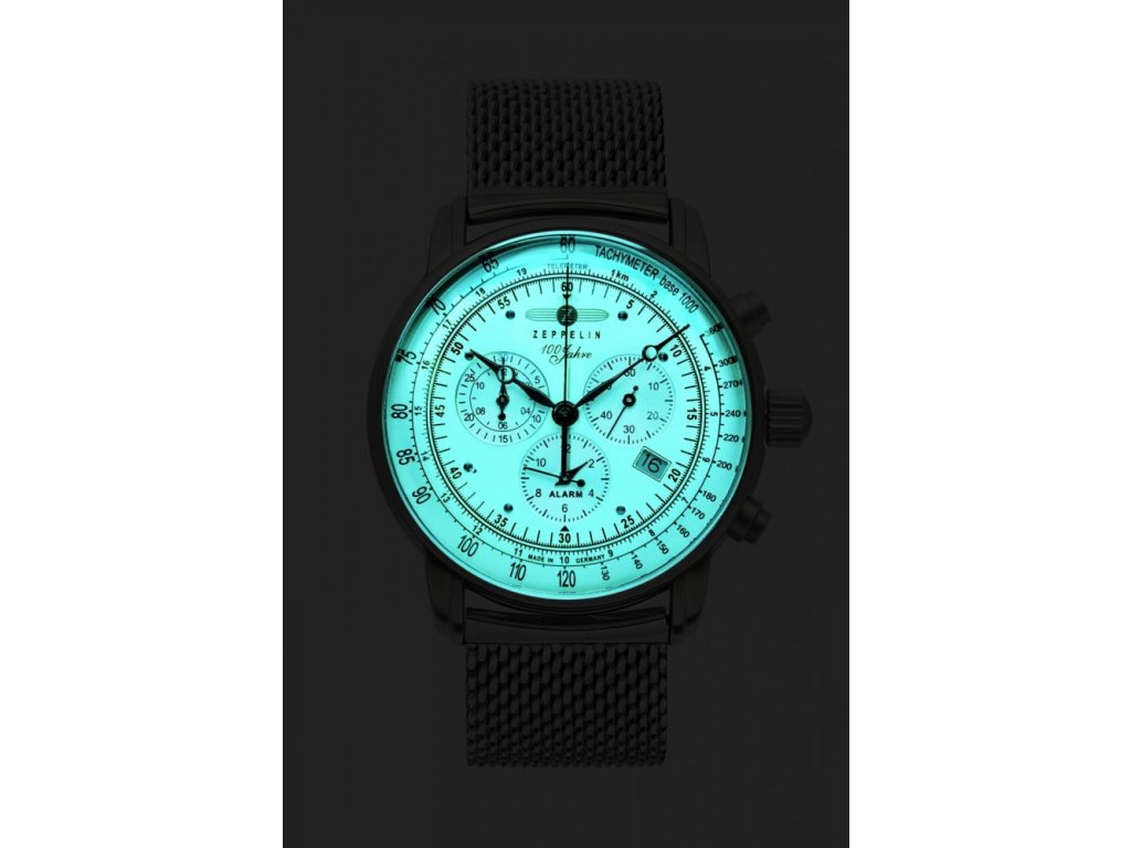 Pokud hledáte hodinky s tradičním vzhledem německé firmy Zeppelin, model Zeppelin 8680M-3 z řady 100 Years Zeppelin Edition 1 je tou pravou volbou. Nabízí řadu funkcí jako chronograf, budík, ukazatel data, telemetr a tachymetr. Hodinky mají luminiscenční podklad ciferníku pro skvělou čitelnost ve tmě. Pouzdro je vyrobeno z ušlechtilé oceli a doplněno ocelovým mesh tahem. S průměrem pouzdra 42 mm a minerálním sklíčkem skvěle padnou na většinu pánských zápěstí. Model je poháněn bateriovým švýcarským strojkem Ronda 5130.D, má vodotěsnost 50 m a záruku 5 let.Doplňkové parametry