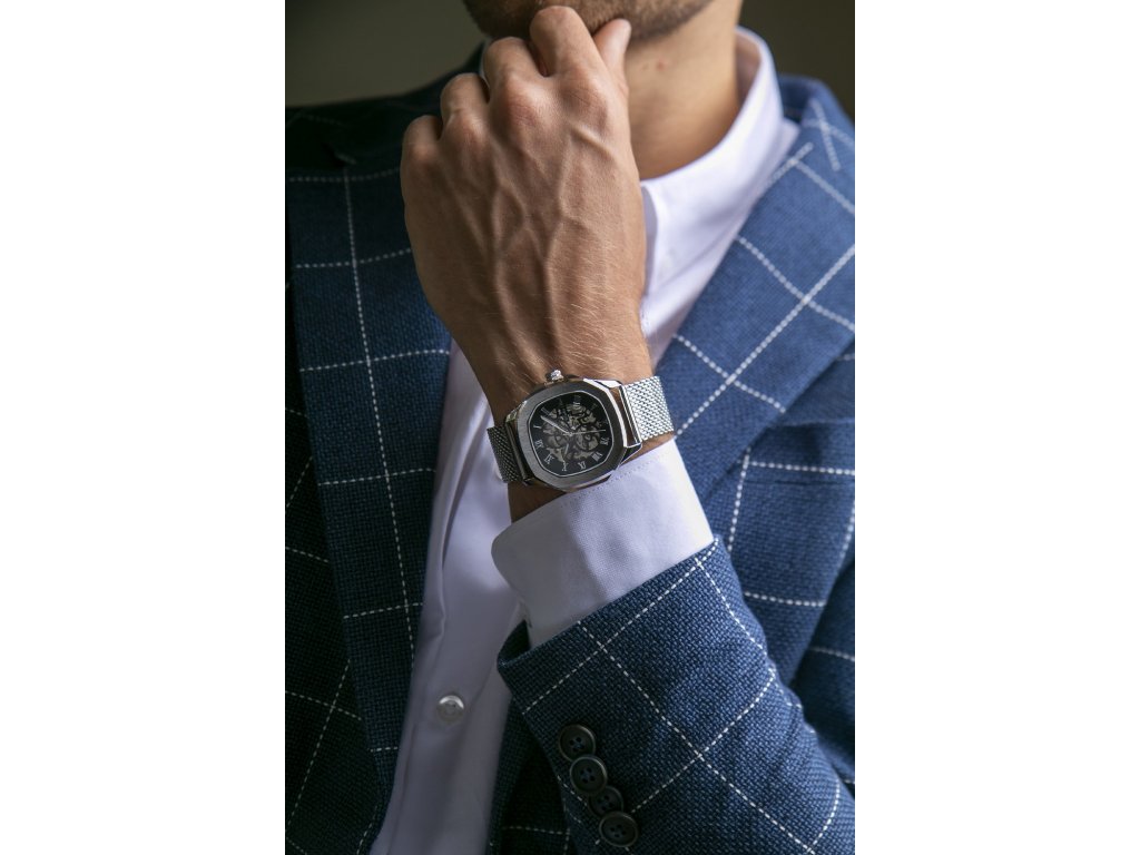 Pánské celostříbrné hodinky s hranatým tvarem pouzdra, černým číselníkem s římskými číslicemi, ve skeletonové úpravě.Doplňkové parametry