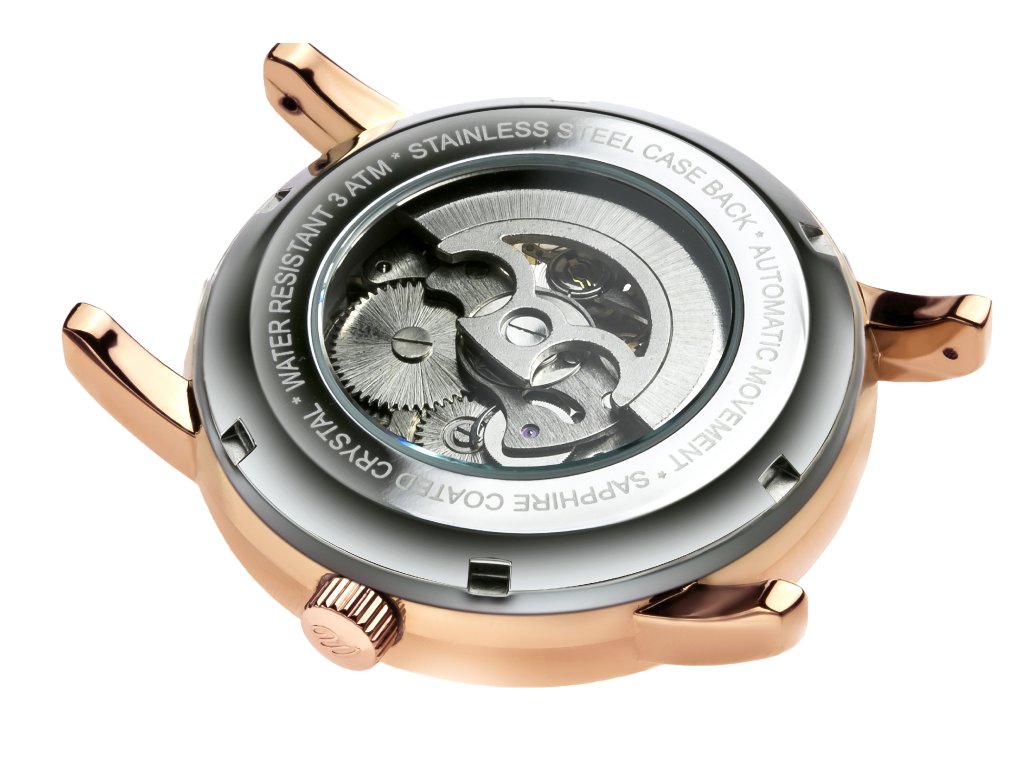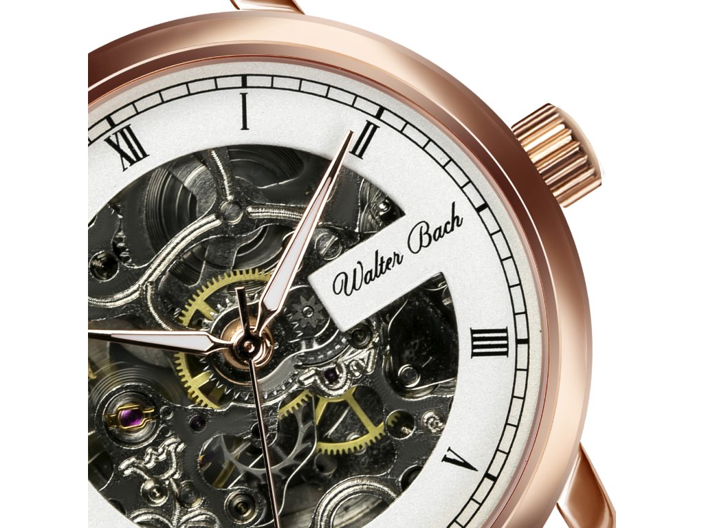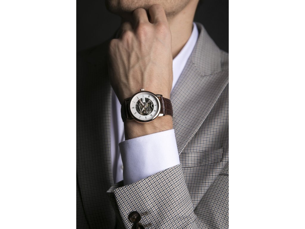 Pánské hodinky s růžovo-zlatým pouzdrem, s hnědým koženým páskem a výrazným bílým číselníkem ve skeletonové úpravě.Doplňkové parametry