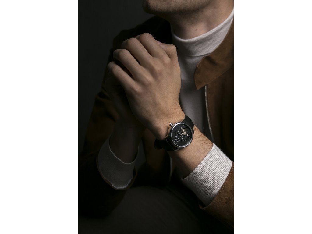 Pánské hodinky v celostříbrné barvě s černým číselníkem s indexy a černým koženým páskem.Doplňkové parametry