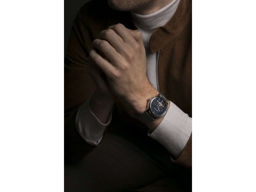 Pánské hodinky v celostříbrné barvě s černým číselníkem s indexy, na meshi.Doplňkové parametry