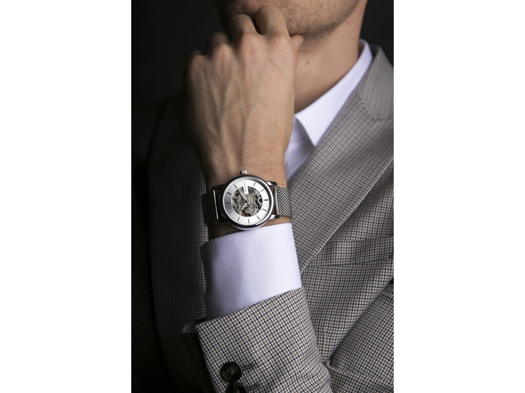 Pánské hodinky se stříbrným pouzdrem, stříbrným číselníkem ve skeletonové úpravě a meshovým páskem.Doplňkové parametry