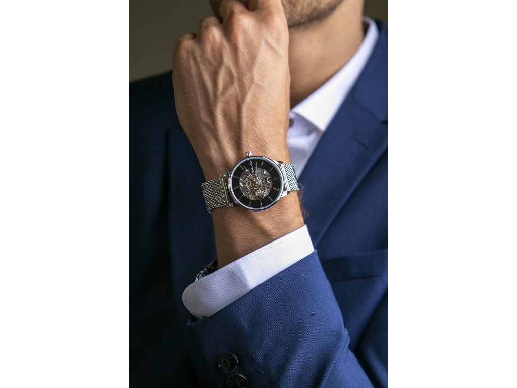 Pánské hodinky stříbrné barvy s pouzdrem, černým číselníkem ve skeletonové úpravě a s meshovým páskem.Doplňkové parametry