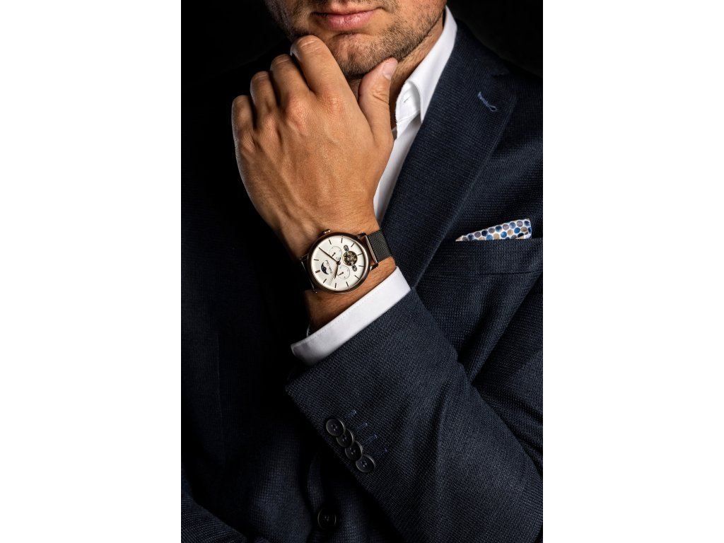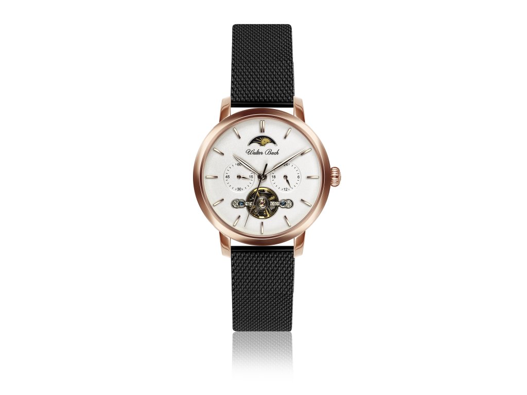 Kovový tah v černé barvě v kontrastu s růžovozlatavým pouzdrem dodává hodinkám na sofistikovaném vzhledu a zajišťuje komfortní nošení. Kulatý bílý číselník o průměru 40 mm je vybaven dvěma chronografy, průhledem na strojek a ukazatelem východu a západu slunce. Tyto prvky spolu s přehlednými indexy a klasickými ručkami vytvářejí harmonický a funkční design.
