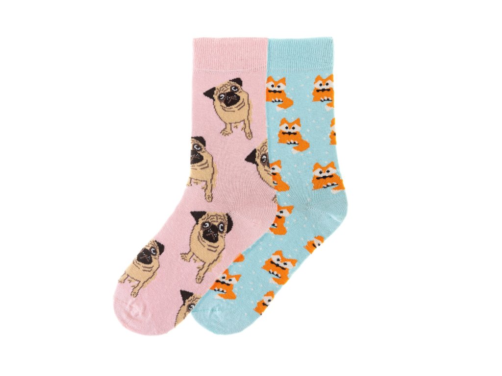 Dva páry, dva roztomilé motivy a spousta hravé energie. Set dámských ponožek Funky Steps ve velikosti 36–40 spojuje růžový pár s přátelským mopsem a světle modré ponožky s puntíky a veselou liškou. Dohromady tvoří kombinaci, která dokáže zlepšit náladu při každém obutí.