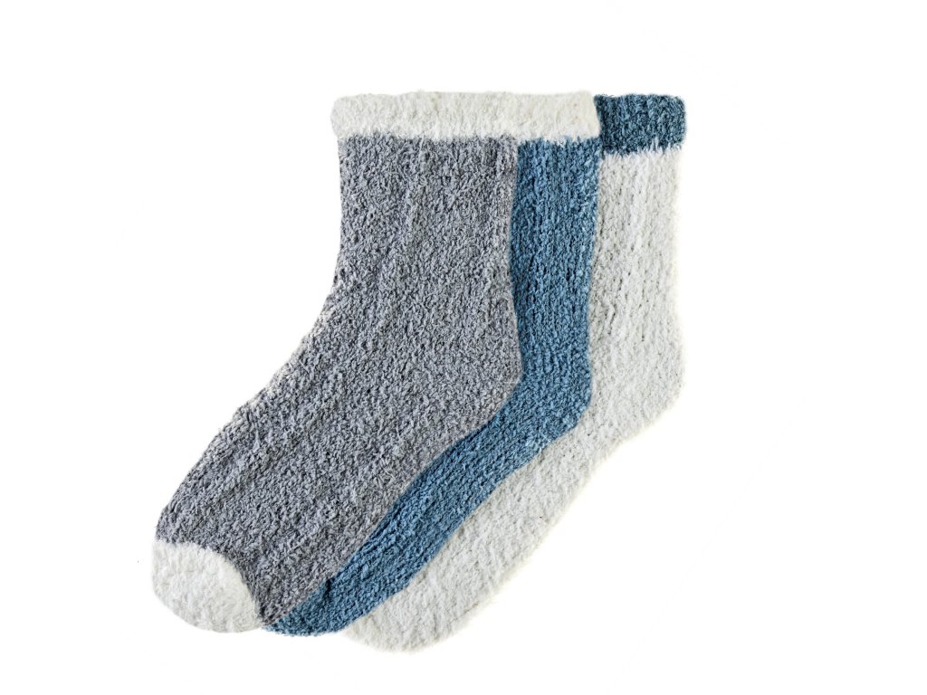 Set obsahuje 3 vyšší ponožky, které jsou šedé, bílé a modré a mají kontrastní lem. Jsou vyrobeny z bavlny s dodatkem polyesteru a spandexu. Díky této kombinaci jsou příjemné na nošení, hřejivé, elastické a odolné.