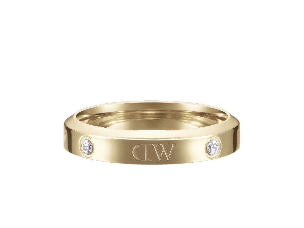 Jemný ocelový prsten ve zlatém provedení, osázený bílými krystaly ve velikosti 52