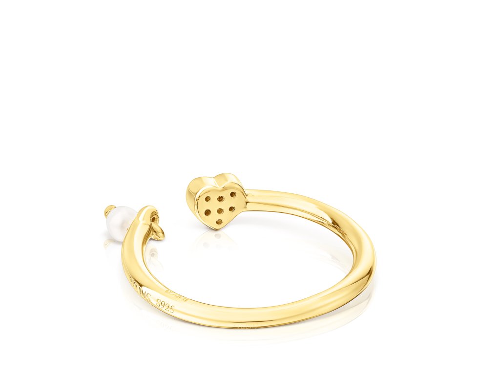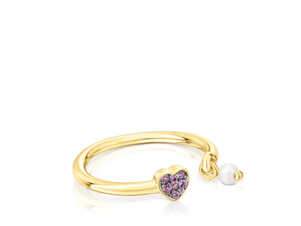 Prsten TOUS New Motif z pozlaceného stříbra se srdcem z ametystu o velikosti 4,4 × 4,6 mm a perlou o průměru 3 mm. Tloušťka prstenu: 1,5 mm.Doplňkové parametry